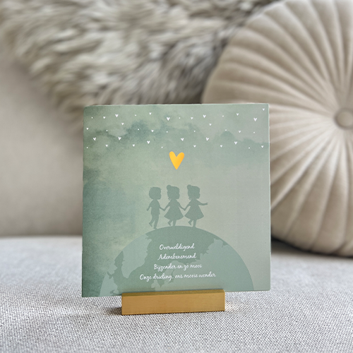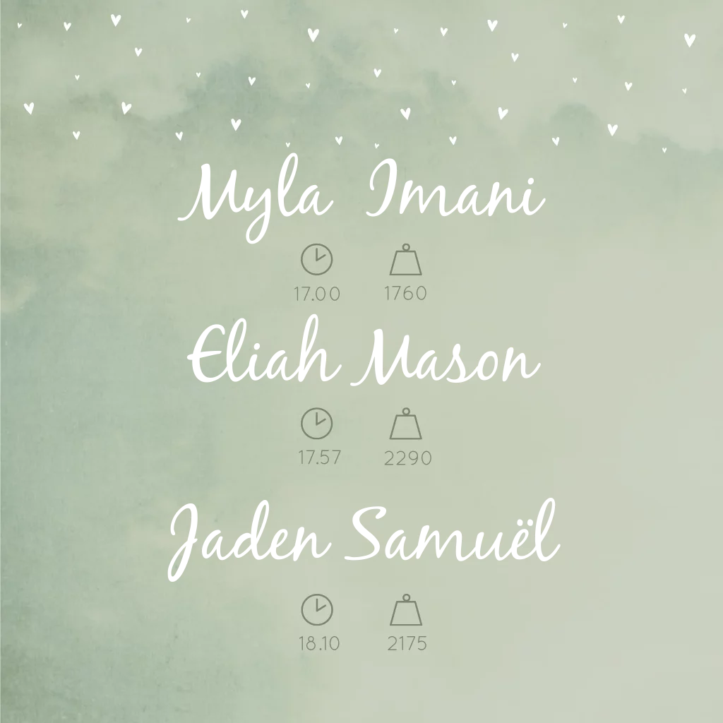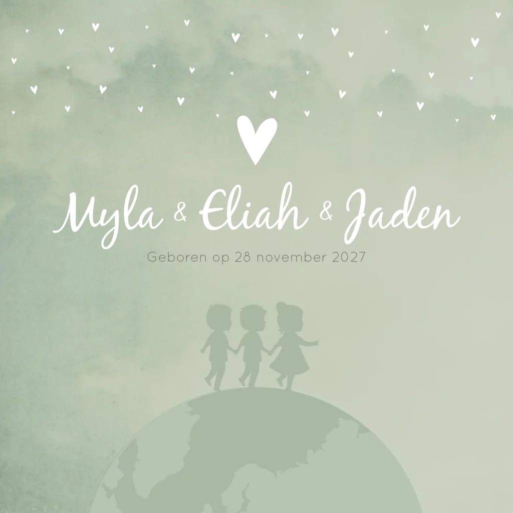 Een mintgroen gewolkt geboortekaartje met een wereldbol waar drie kindjes op lopen. Kaartje Myla, Eliah en Jaden is een prachtig romantisch kaartje voor een drieling.