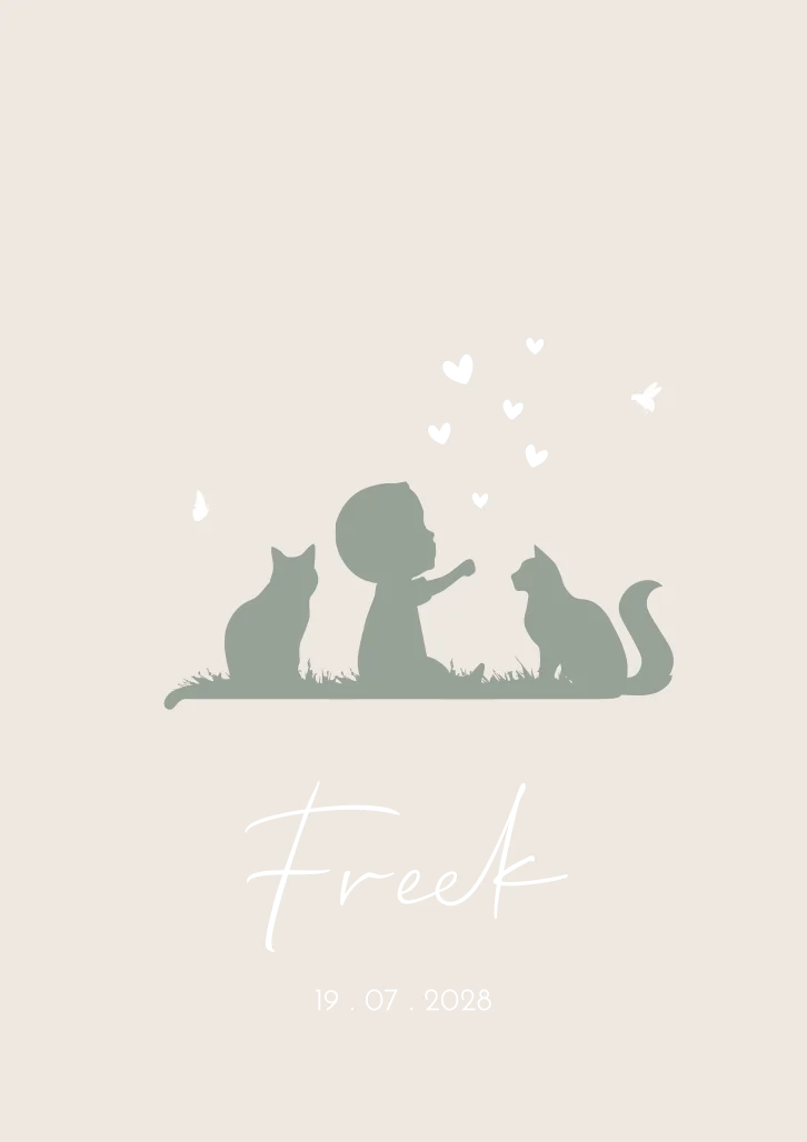 Een trendy enkele staande babykaart Freek in een neutrale beige kleur. Op de geboortekaart zit een jongetje op het gras, tussen twee katten in. De poesjes kijken naar het kleine kindje. Ze zijn omringt door hartjes in koperfolie en een bij en vlindertje. Je past het kaartje volledig zelf aan in de editor.