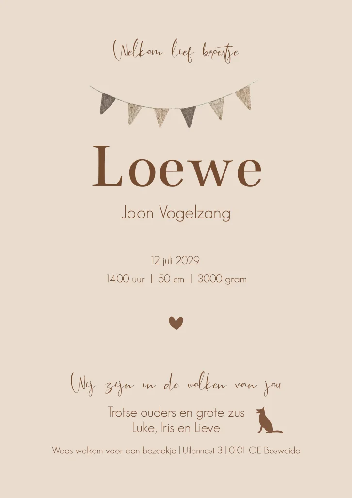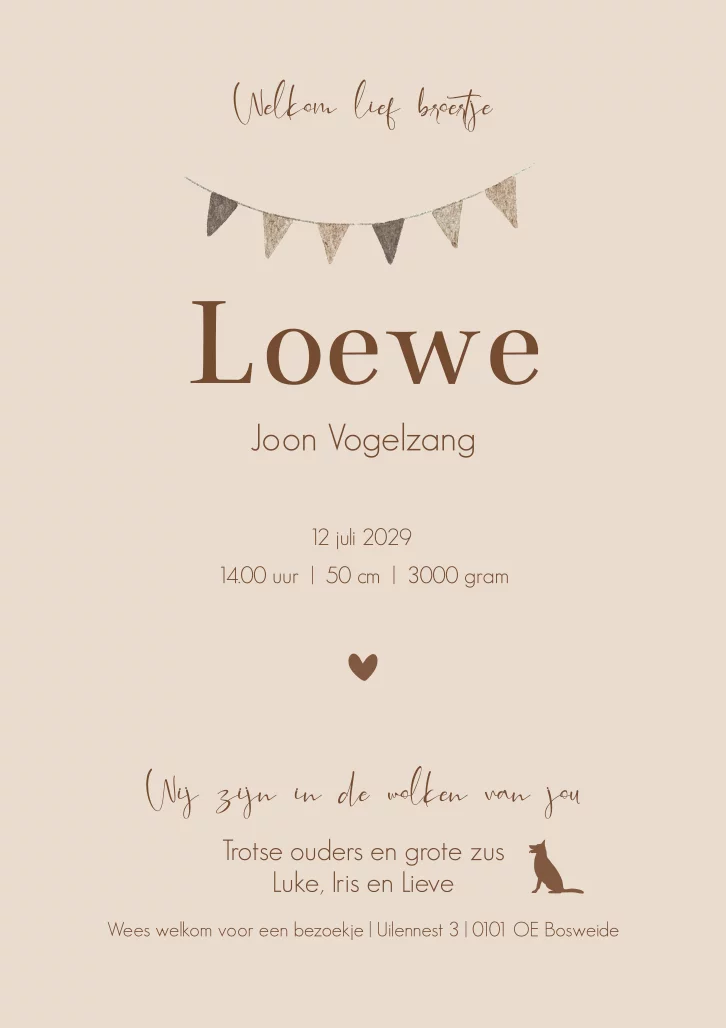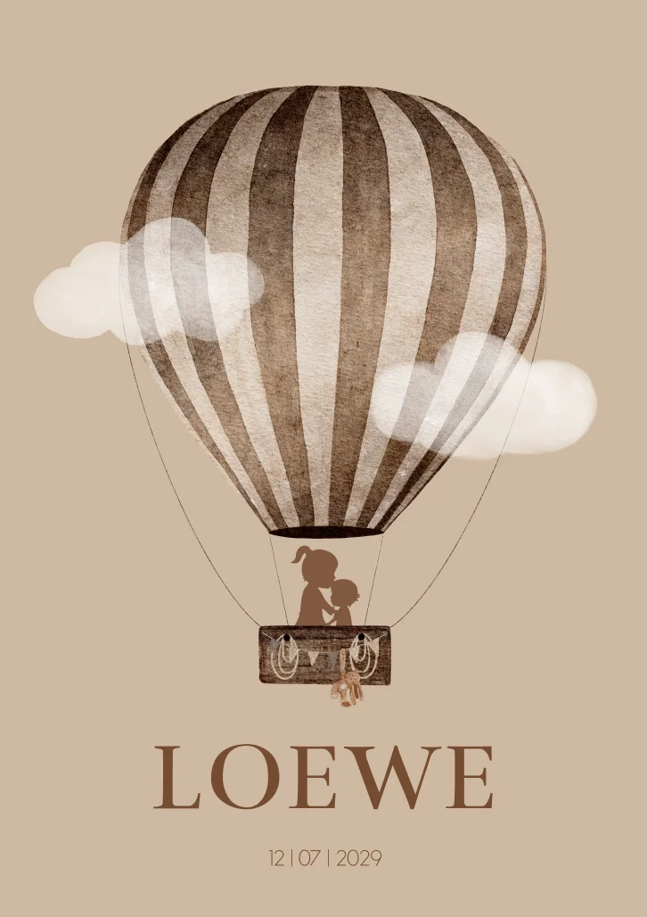 Een super stoer geboortekaartje Loewe in beige bruine naturel tinten. Grote zus en broer zitten in een bruine luchtballon en gaan op avontuur. Ze zijn helemaal in de wolken. De wolkjes op de kaart maken het een levendig tafereel. Je kunt alles gemakkelijk naar je wensen aanpassen.