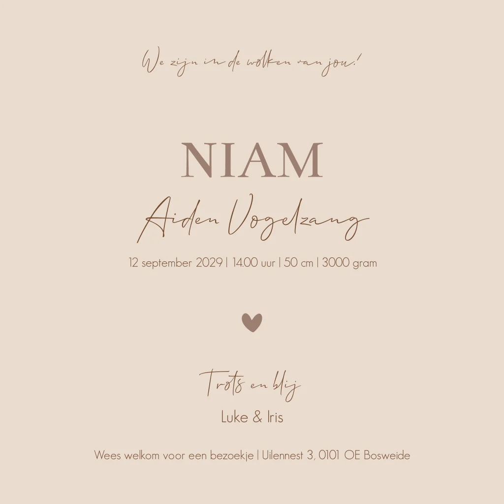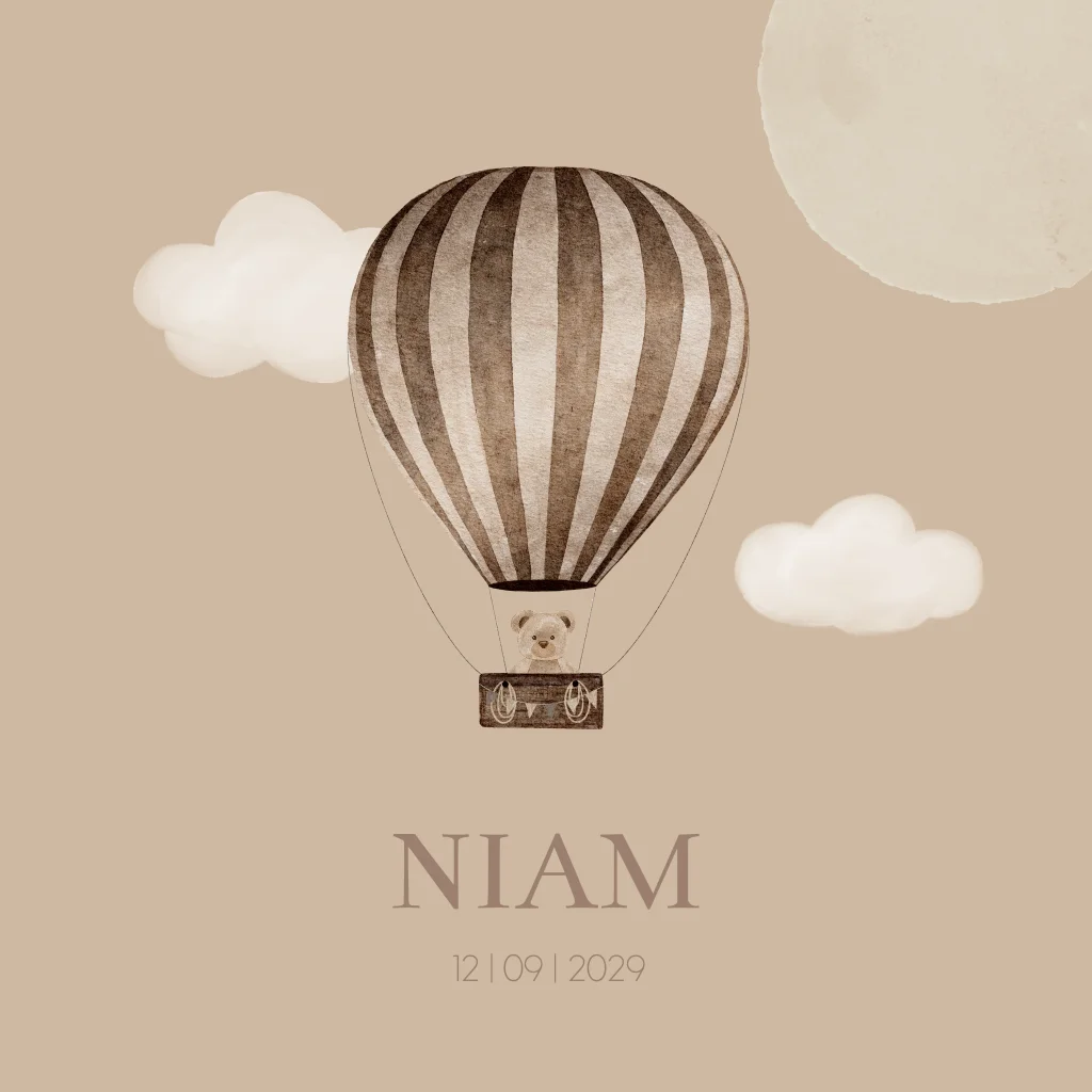Een super stoer geboortekaartje Niam in beige bruine naturel tinten. Het teddy beertje zit in een bruine luchtballon. De wolkjes en zon/maan op de kaart maken het een levendig tafereel. Je kunt alles gemakkelijk naar je wensen aanpassen.