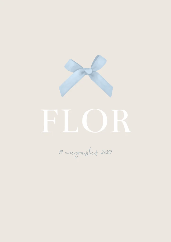 Een klassiek en tijdloos geboortekaartje Flor in neutrale en blauwe kleuren. Het strikje maakt het wat chique. Je kunt alles gemakkelijk naar je wensen aanpassen, ook de kleur van het strikje.