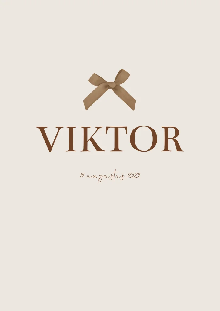 Een klassiek en tijdloos geboortekaartje Viktor in neutrale en bruine kleuren. Het strikje maakt het wat chique. Je kunt alles gemakkelijk naar je wensen aanpassen, ook de kleur van het strikje.