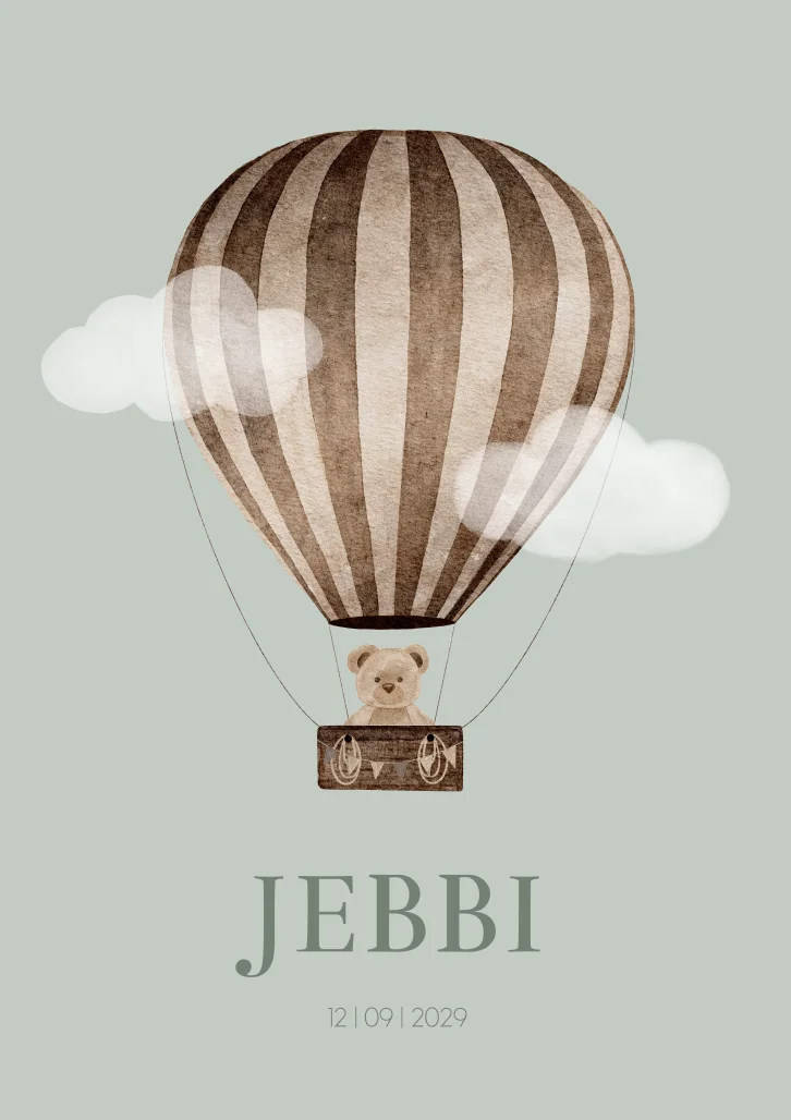 Een super stoer geboortekaartje Jebbi in beige bruine naturel tinten en een oud groene zachte kleur. Het teddybeertje zit in een bruine luchtballon. De wolkjes en zon/maan op de kaart maken het een levendig tafereel. Je kunt alles gemakkelijk naar je wensen aanpassen.