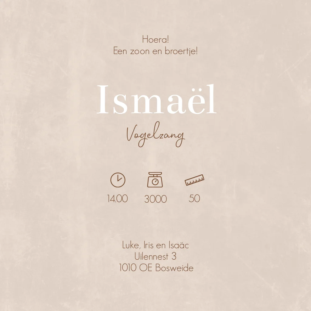 Stoer linnen Savanne geboortekaartje Ismaël met een illustratie van een leeuwen familie. De leeuwin heeft een welpje in haar bek en grote broer wil met het welpje spelen. Heb je liever andere dieren op de kaart? Dat kan! Zoek het dier in onze editor en plaats hem op de kaart.