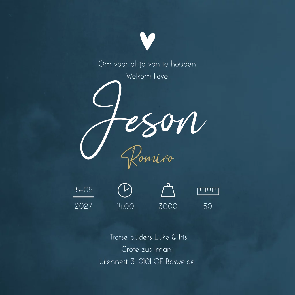 Hip en trendy donker nachtblauw geboortekaartje met gouden hartje en naam. Geboortekaartje Jeson is ontzettend mooi wanneer je het bedrukt met goudfolie, in combinatie met de donkerblauwe achtergrond springt de naam er uit.