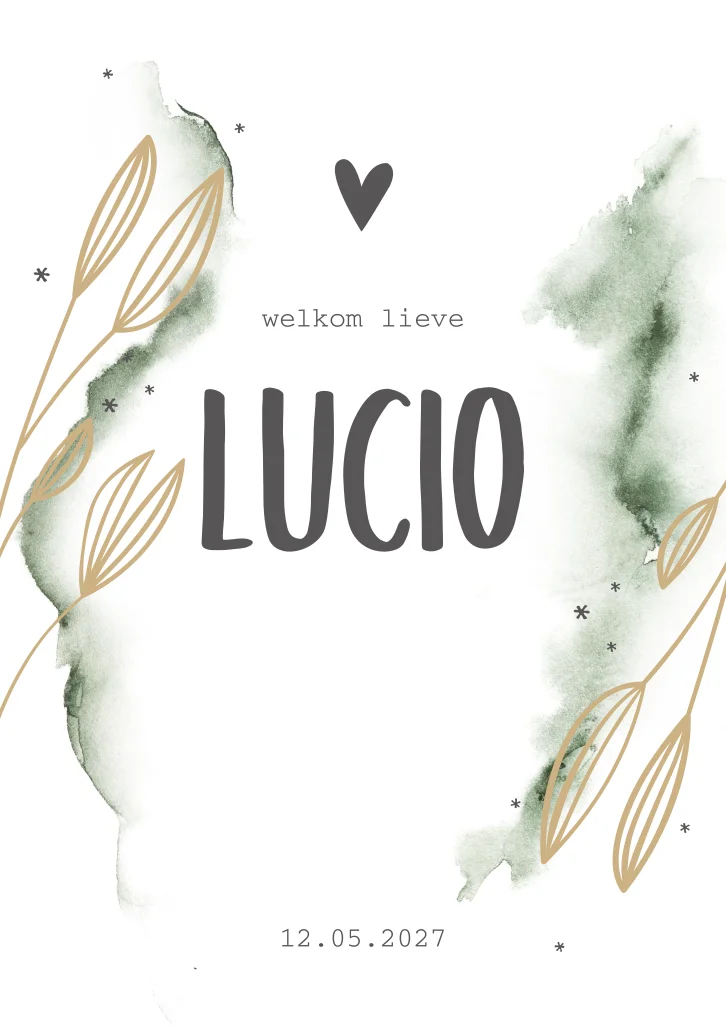 Sierlijk en stijlvolle witte babykaart Lucio met groene aquarel vlekken, gouden takjes, sterretjes en hartjes. Je kunt de kaart volledig zelf aanpassen in de editor zodat het bijvoorbeeld helemaal matched bij de babykamer van je kindje.