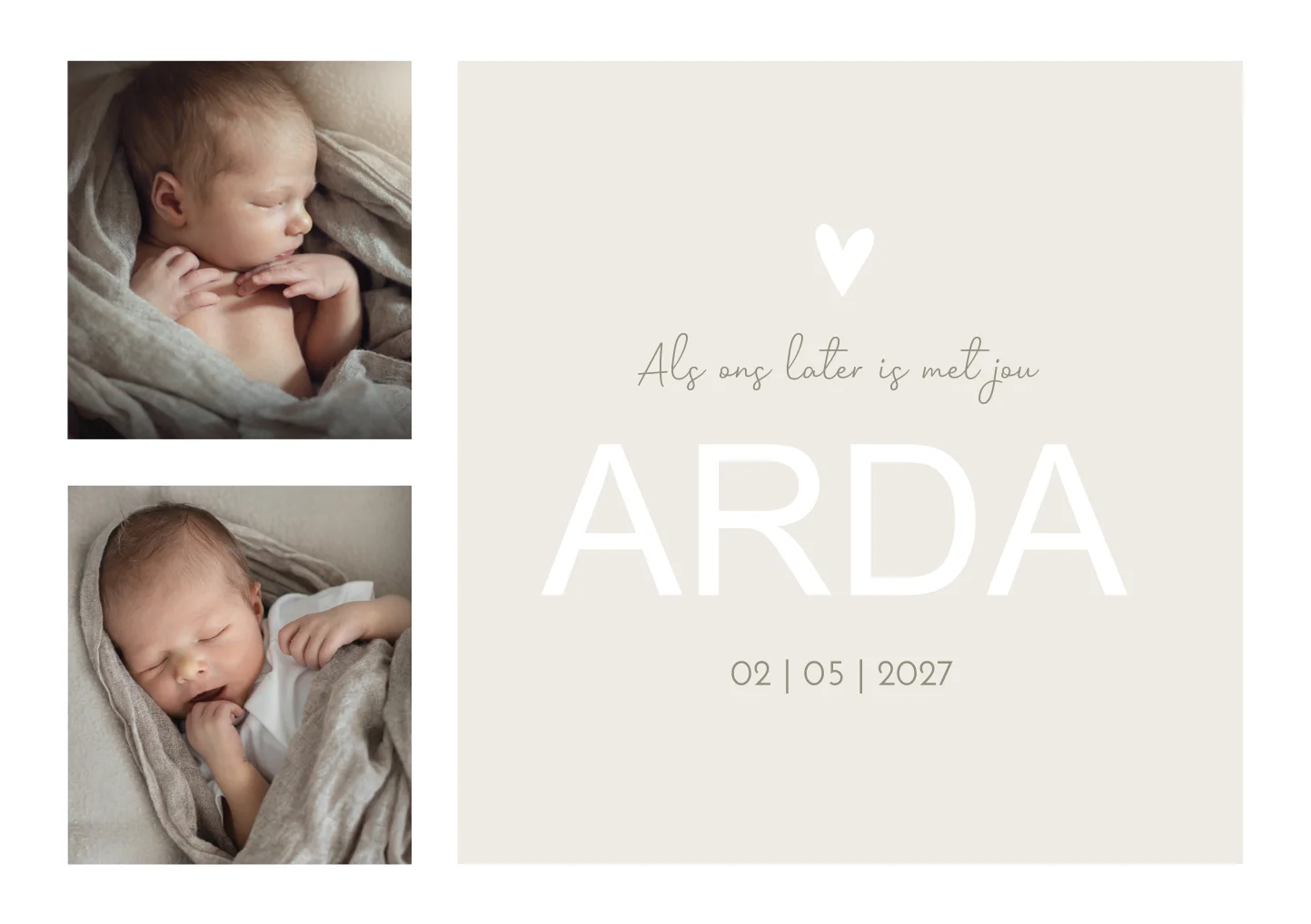 Chique neutraal geboortekaartje met 2 babyfoto's en een beige/ crème kleurvlak met witte letters. Kaart Arda is prachtig in zijn eenvoud, maar wil je er iets aan veranderen? Je maakt het helemaal eigen in onze editor!