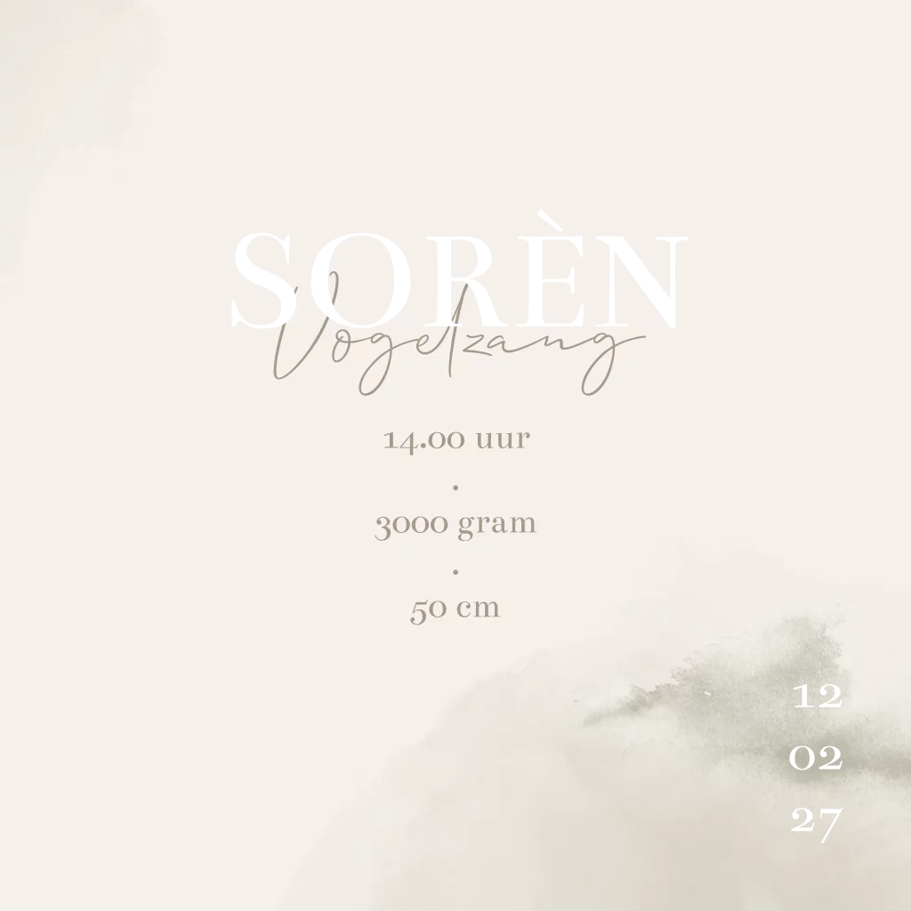 Stijlvol en tijdloos ontwerp voor een babykaartje in beige en crème natuurlijke tinten. De waterverf vormen maken het kaartje speels en hip. De naam Sorèn is in goudfolie gezet. Dit kun je gemakkelijk zelf aanpassen in de online editor.