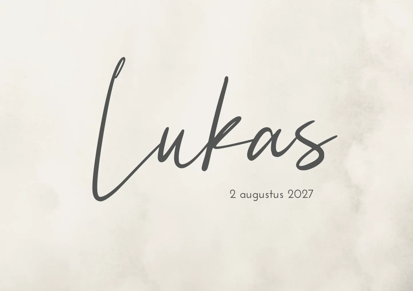Stoer gewolkt geboortekaartje Lukas Vince met wolk effect in beige/ crème kleur met de naam groot in antraciet kleurige letters. De achterzijde van dit geboortekaartje is volledig wit met antraciet kleurige letters. Wil je het kaartje liever in een andere trendy kleur die past bij de stijl van de babykamer? Pas dit ontwerp dan helemaal naar je eigen smaak aan in onze editor!