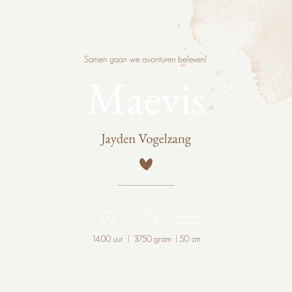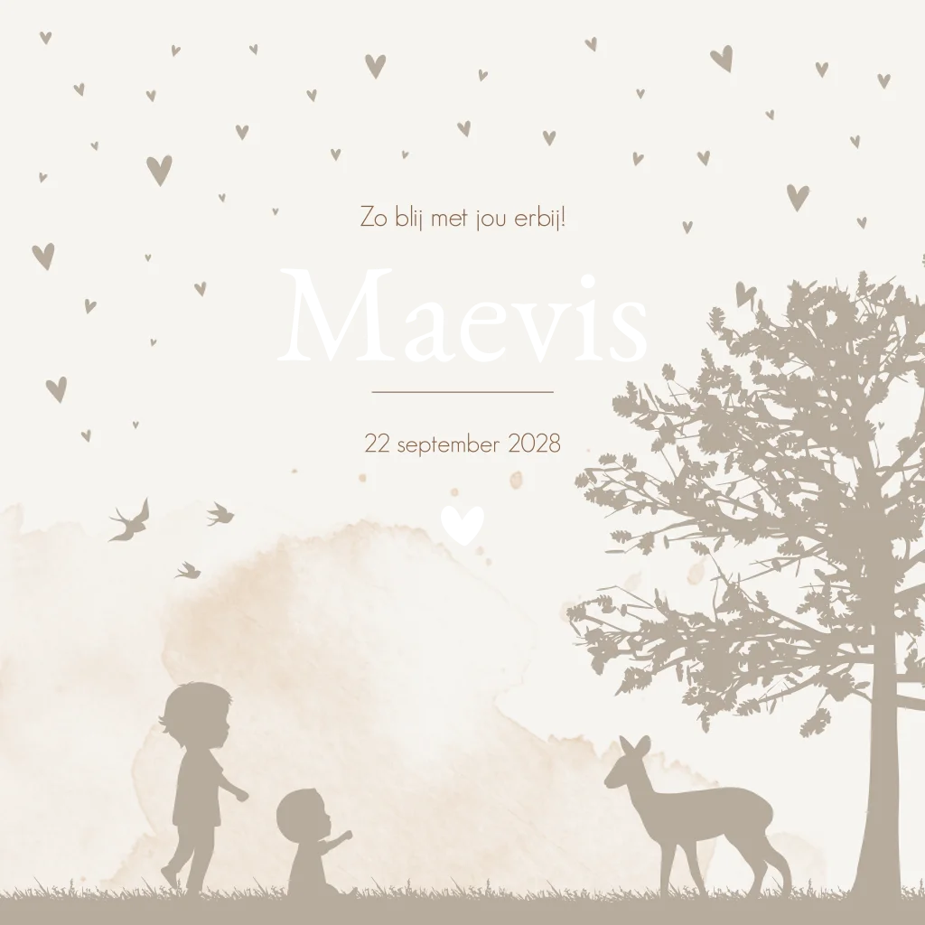 Een beige creme geboortekaartje Maevis met waterverf effect en een illustratie van twee kindjes, een boom en hertje. Je kunt de illustraties van kindjes en dieren helemaal zelf aanpassen naar jouw gezinssituatie of huisdieren. Je vindt het allemaal in onze beeldbank in onze online editor. Heb je onze hulp erbij nodig? App of mail gerust!