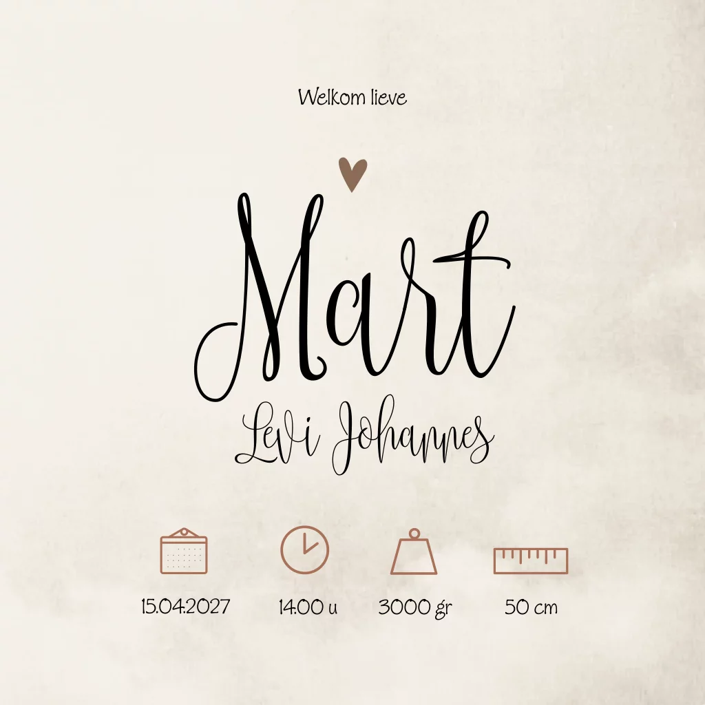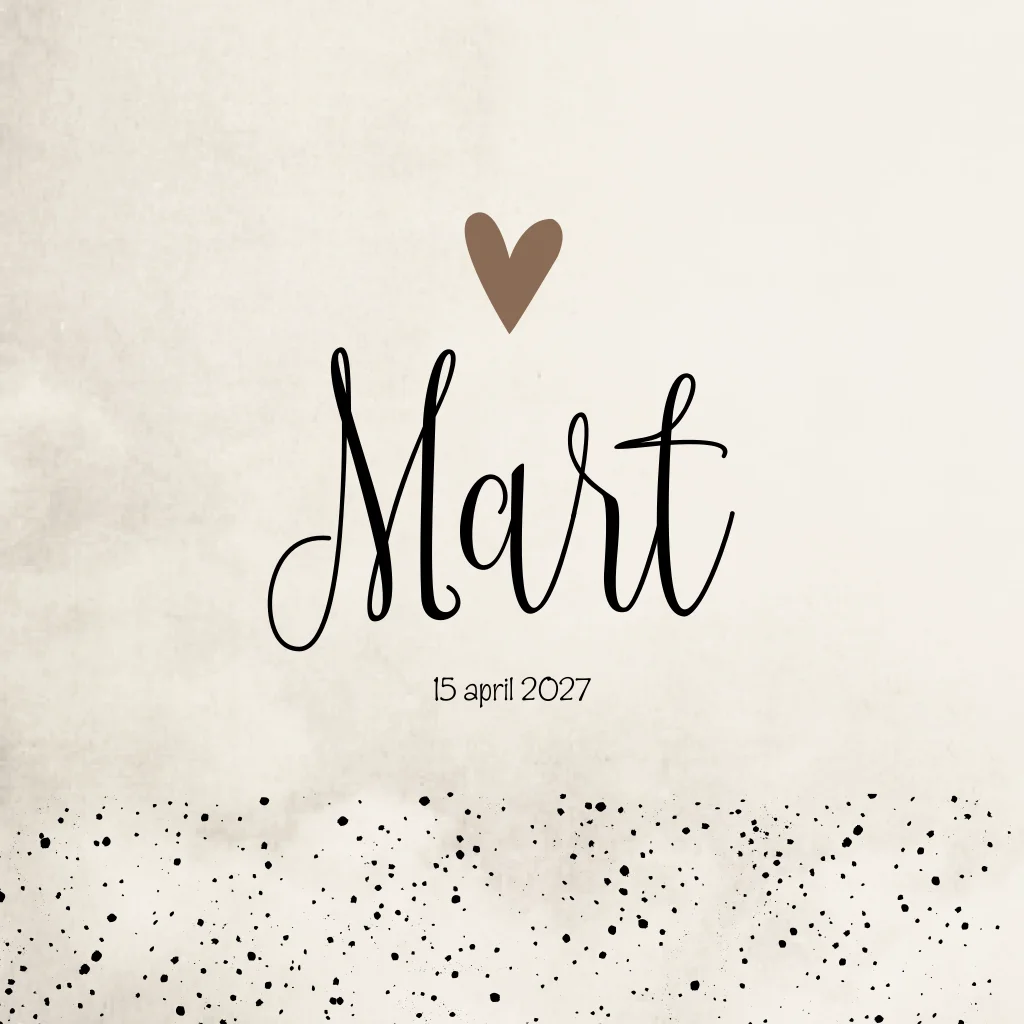 Beige/crème gewolkt geboortekaartje met zwarte stipjes. Geboortekaartje Mart is een neutraal geboortekaartje. Laat het hartje bedrukken met koperfolie voor een extra mooi effect op het kaartje.