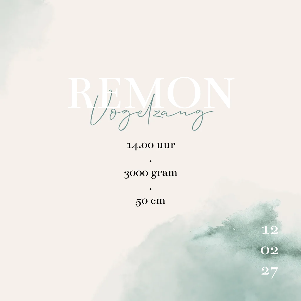 Stijlvol en tijdloos ontwerp voor een babykaartje in beige en mintgroene tinten. De waterverf vormen maken het kaartje speels en hip. De naam Remon is in zilverfolie gezet. Dit kun je gemakkelijk zelf aanpassen in de online editor.