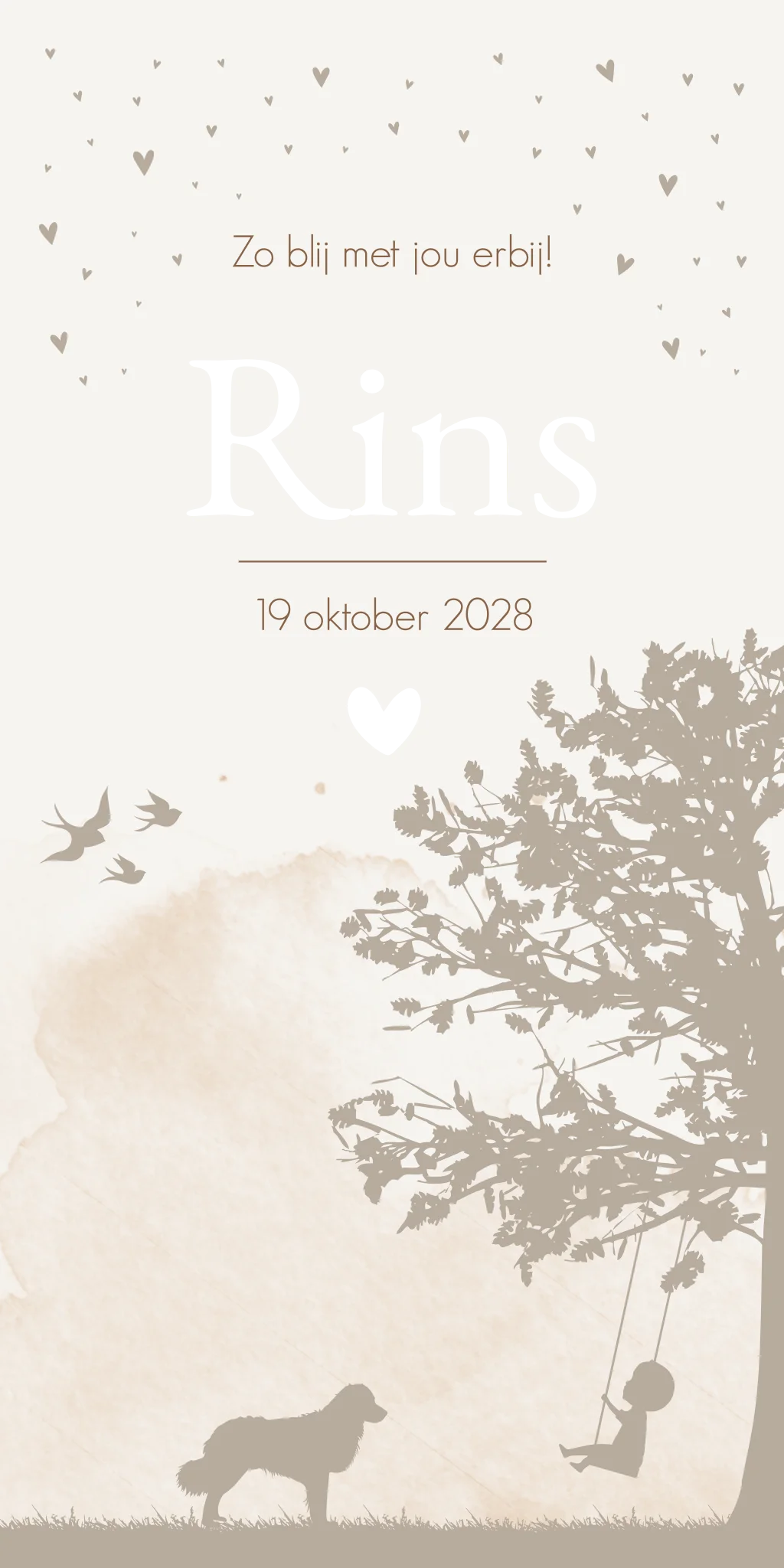 Een warm en stijlvol geboortekaartje Rins met wolkjes en een boom waar een schommel in hangt. Een kindje is heerlijk aan het schommelen en de hond kijkt toe. De kaart is bedrukt met koperfolie. Je kunt het eenvoudig en snel aanpassen naar je eigen wensen. Ook is het mogelijk om het zonder folie te laten bedrukken.