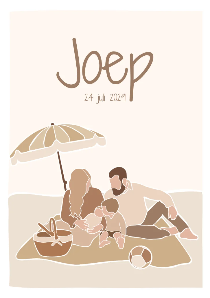 Een kersvers gezin dat aan het picknicken is op het strand. Zie je liever een andere gezinssamenstelling of kleuren? Mail dan je wensen naar info@hetuilennestje.nl