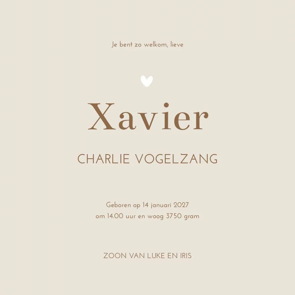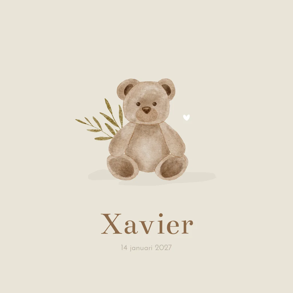 Stoer en tijdloos geboortekaartje Xavier in beige crème kleur met een waterverf illustratie van een teddybeertje en een groen takje en een wit hartje. De kaart is volledig aanpasbaar qua kleur, opmaak en tekst. Heb je onze gratis hulp erbij nodig? Mail of app ons dan even, dan helpen we je graag!