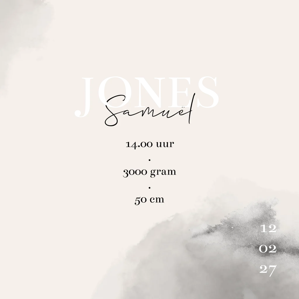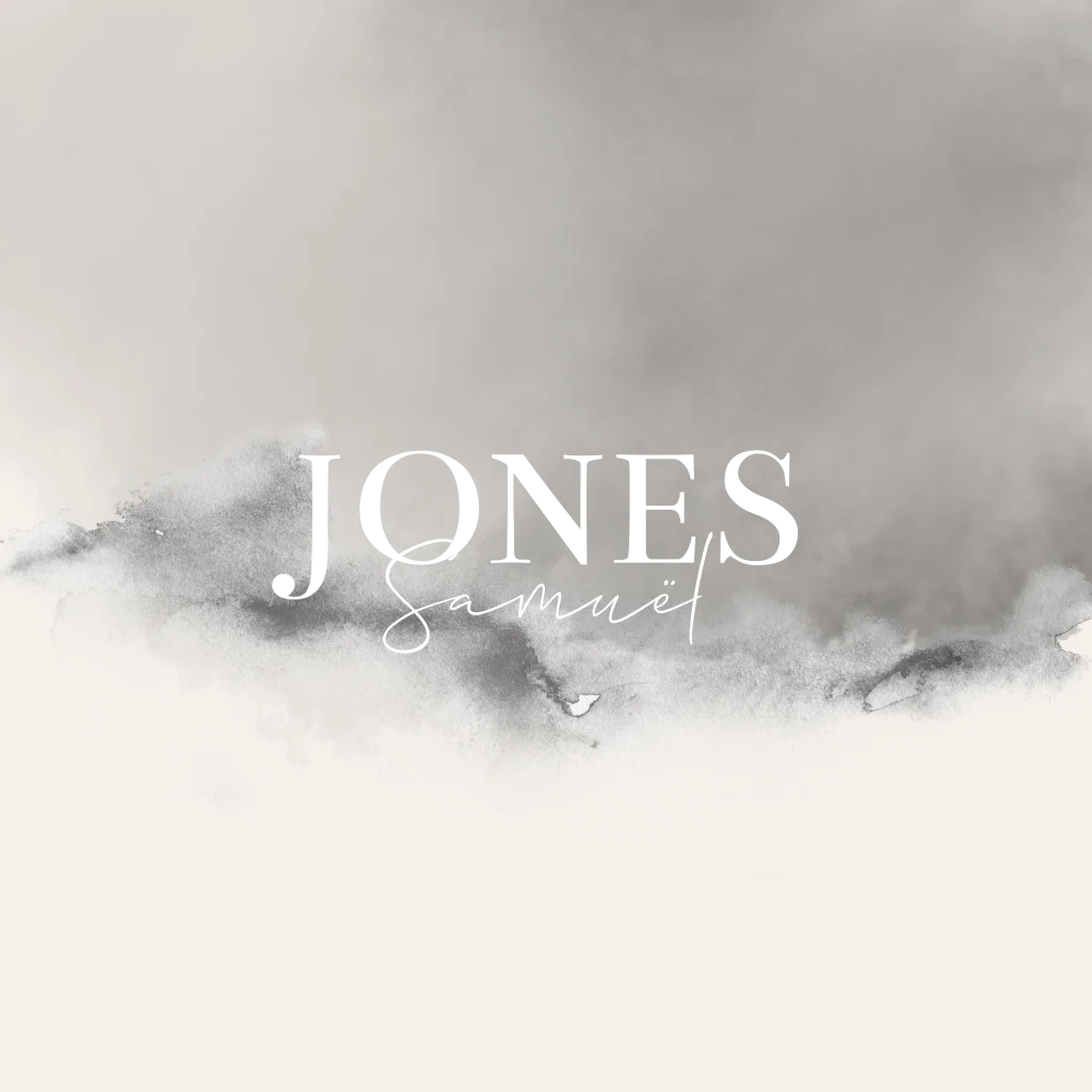 Stijlvol en tijdloos ontwerp voor een babykaartje in beige en zwarte tinten. De waterverf vormen maken het kaartje speels en hip. De naam Jones is in zilverfolie gezet. Dit kun je gemakkelijk zelf aanpassen in de online editor.