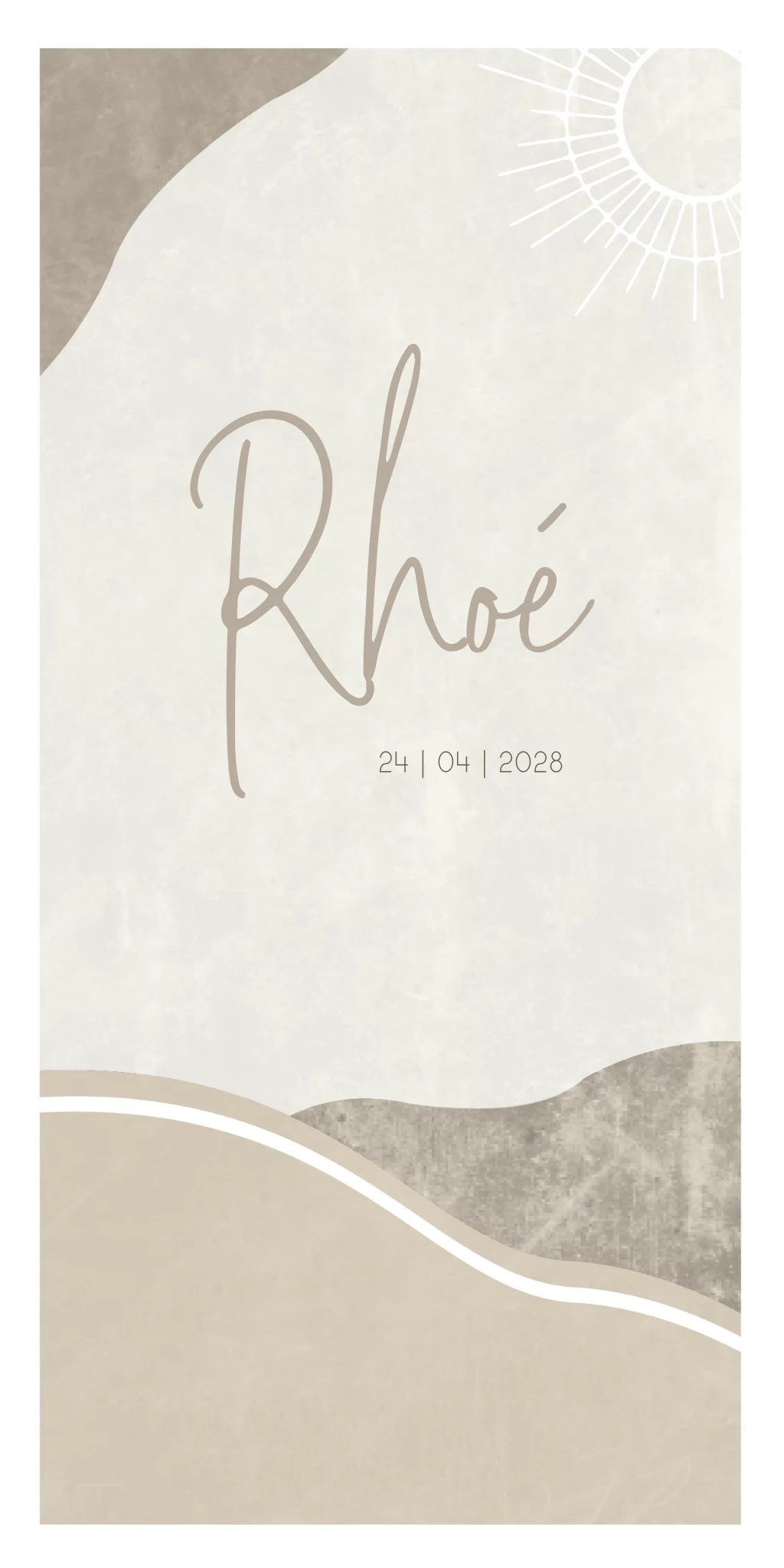 Een artistiek geboortekaartje Rhoé waar je een berglandschap in kunt zien of trendy kleurvlakken in beige/ crème/ bruine tinten met witte lijnen.