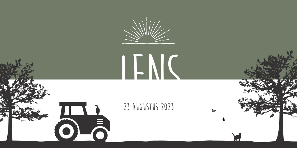 Illustratief groen wit babykaartje Jens voor een jongen met stoere tractor, illustraties van bomen en 2 katten in antraciet grijze kleur. Je maakt de kaart helemaal eigen door illustraties toe te voegen of te verwijderen. Ook kun je illustraties van kindjes toevoegen aan deze kaart.