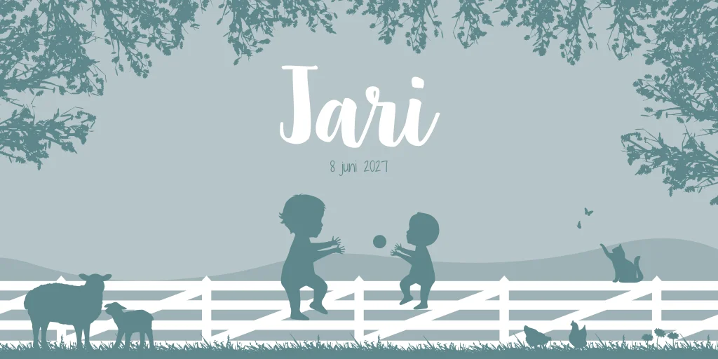 Een vrolijk geboortekaartje in een blauwe kleur. Op kaartje Jari zie je twee broertjes op een hek die een bal overgooien. Zij worden omringd door verschillende (boerderij) dieren zoals schaapjes, kippen en katten. Wil je andere diertjes op kaartje Jari? Neem dan een kijkje in onze editor voor alle opties!
