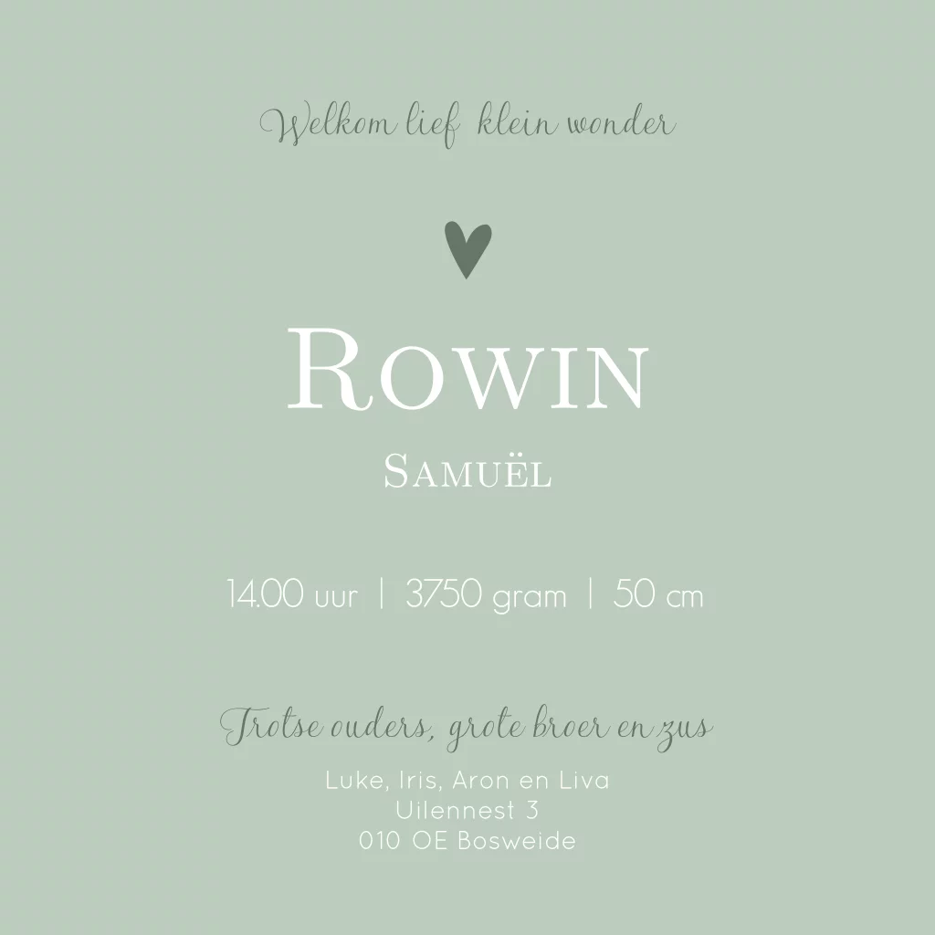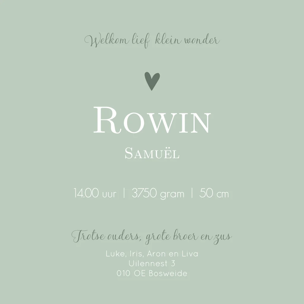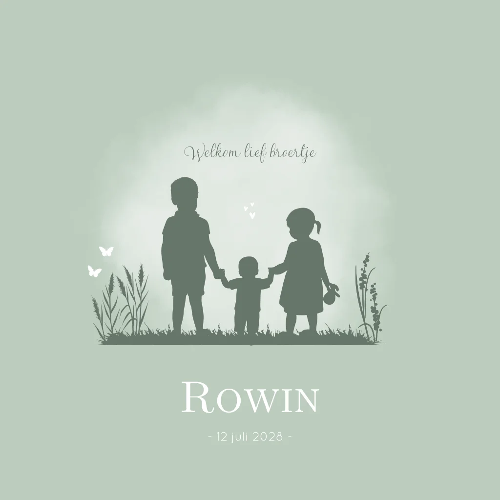 Een mintgroen geboortekaartje Rowin met een silhouet illustratie van een broer en zus die hun kleine broertje aan de hand houden. Ze wandelen samen in de natuur. Er fladderen 2 vlinders en de liefde spat er vanaf in de vorm van hartjes. Je past de illustraties, opmaak en kleuren helemaal zelf aan in onze online editor!