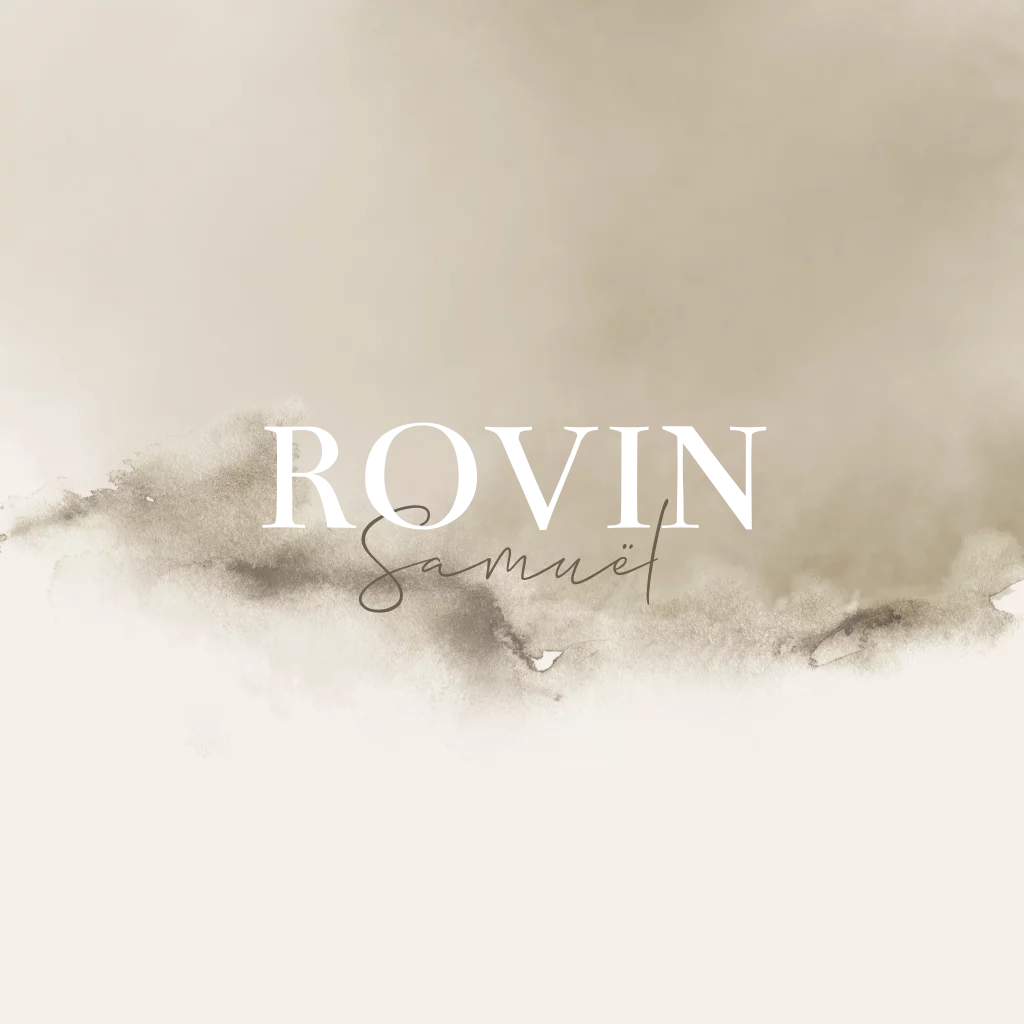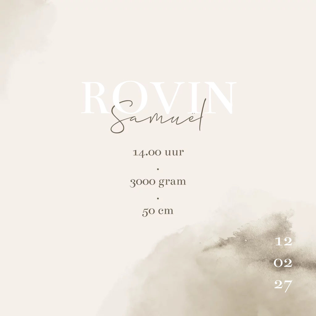 Stijlvol en tijdloos ontwerp voor een babykaartje in beige en bruine natuurlijke aardetinten. Perfect voor de herfst! De waterverf vormen maken het kaartje speels en hip. De naam Rovin is in koperfolie gezet. Dit kun je gemakkelijk zelf aanpassen in de online editor.