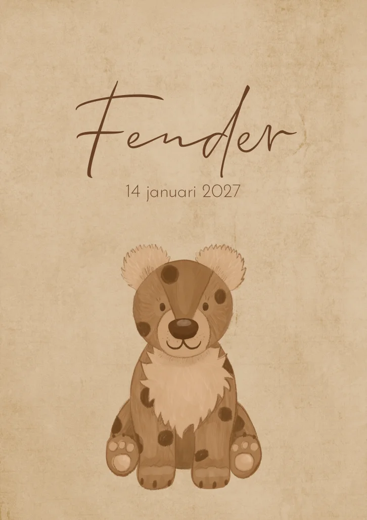 Een bruin gevlekt geboortekaartje met daarop een schattige illustratie van een jaguar. Op de achterzijde van kaartje Fender staat een dierenkop.