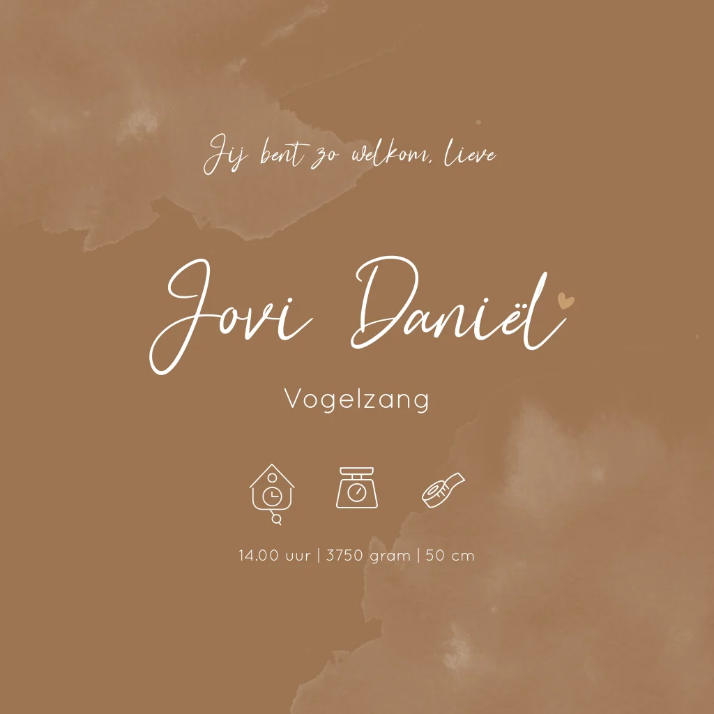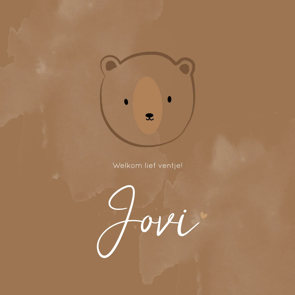 Een illustratief warm geboortekaartje in bruine tinten met een lijntekening van een teddybeertje. De kaart heeft witte vlekken wat het een stoer kaartje maakt.