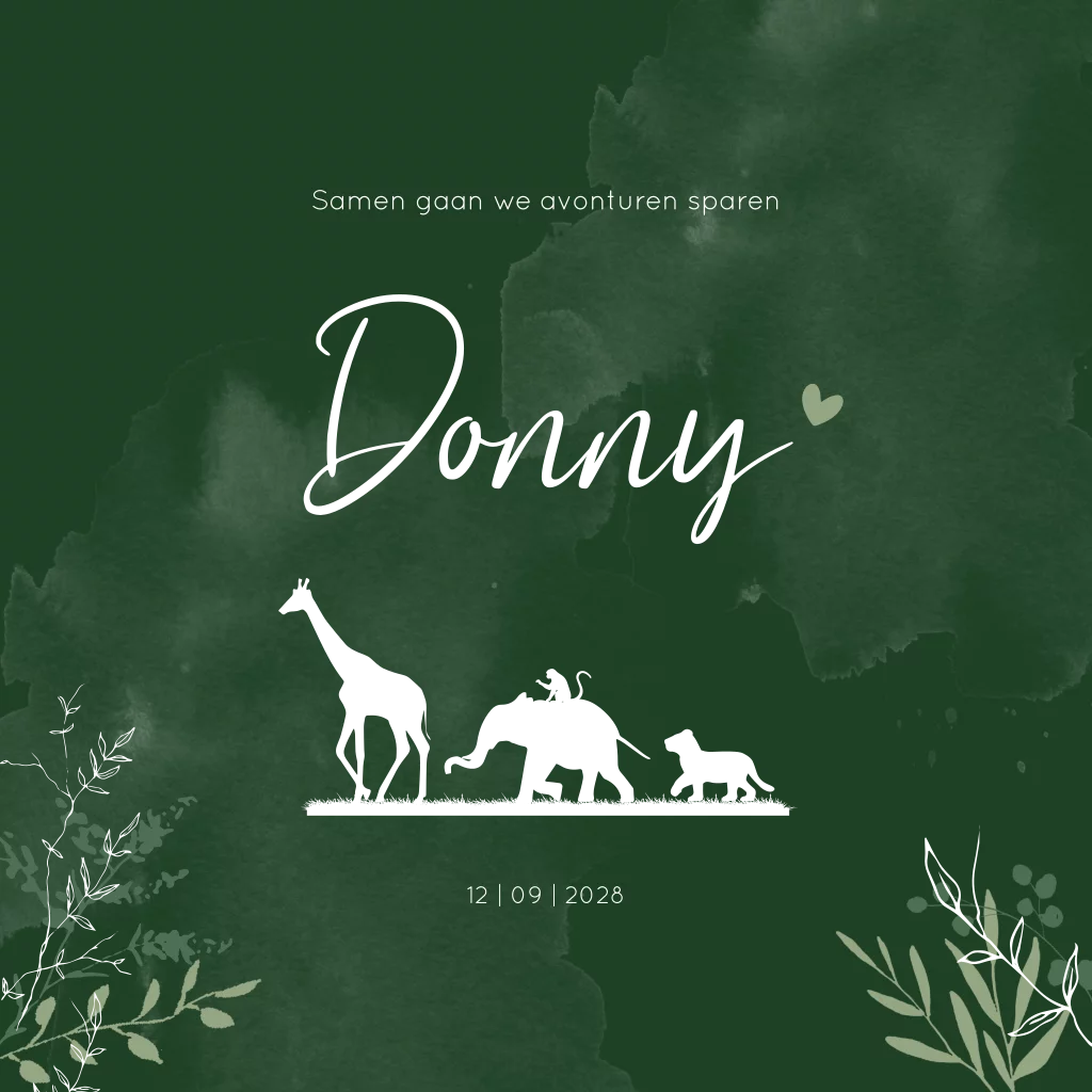 Een illustratief warm donker groen Savanne geboortekaartje met een silhouet tekening van een giraffe, olifantje en leeuwtje. De kaart heeft witte vlekken wat het een stoer kaartje maakt. De takjes en groene kleuren en goudfolie zorgt voor een speels effect.