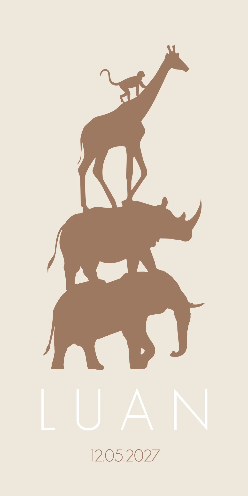 Een naturel kleurig kaartje met een leuke dierenstapel! Kaartje Luan is een stoer en vrolijk geboortekaartje vol met wilde dieren zoals een olifant, neushoorn, giraffe, aap, toekan en stokstaartje. Wil je liever andere dieren op de kaart? Pas het kaartje dan gemakkelijk zelf aan in onze editor!