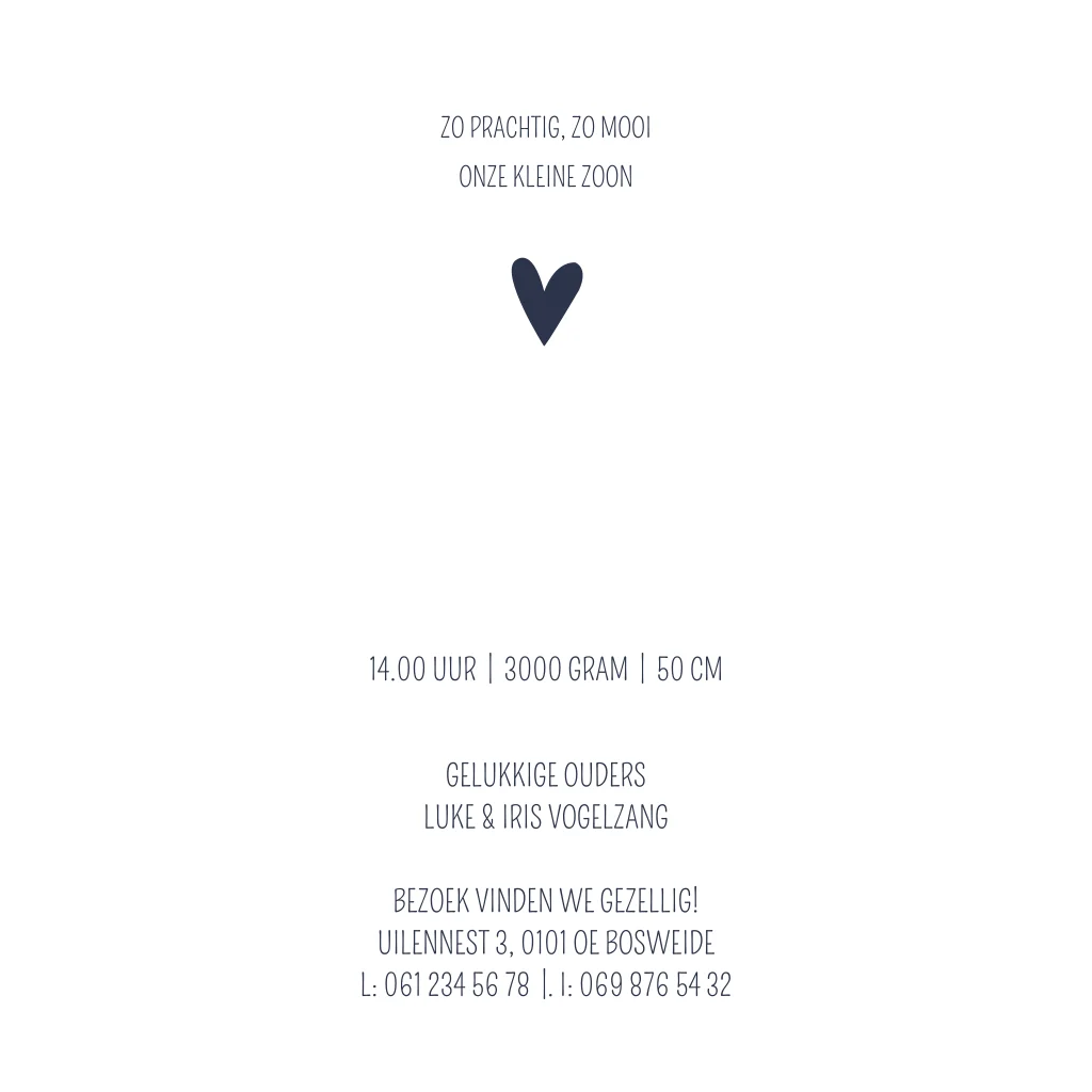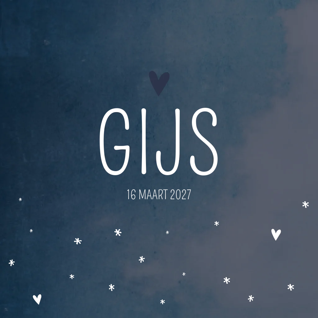 Stoer donkerblauw gewolkt geboortekaartje. Kaartje Gijs heeft een lieve finishing touch door de koperen naam en hartjes. Pas de tekst eenvoudig aan in de editor.