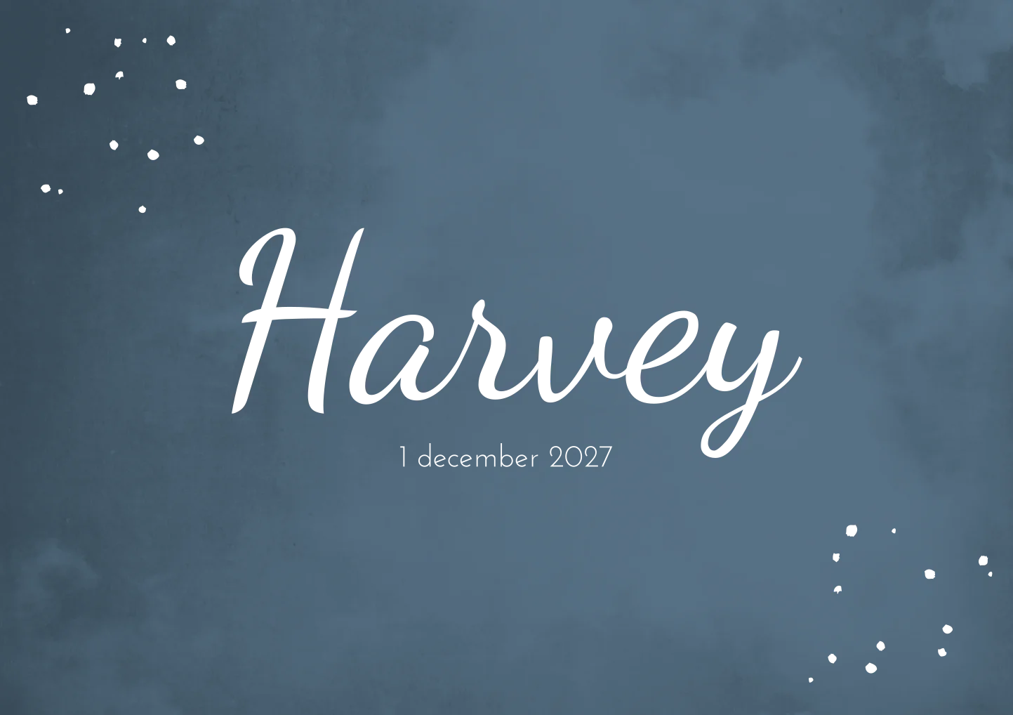 Stoere donkerblauwe geboortekaart in gewolkte sfeer met koperfolie als detail in de stippen en de naam. Kaart Harvey James is stijlvol en tijdloos en volledig aan te passen naar jouw wensen. De kleur, opmaak, teksten en lettertypes kun je volledig eigen maken. Heb je onze hulp nodig? Stuur ons dan een mailtje.