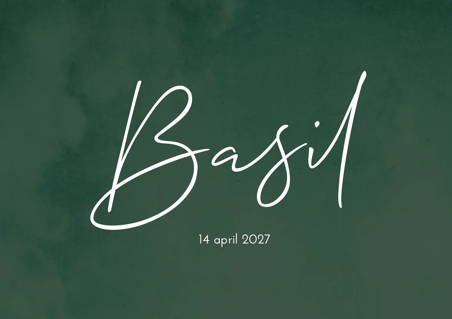 Stoere kaart Basil in donkergroene kleur met de naam groot in witte letters. De achterzijde van dit geboortekaartje is volledig wit met groene letters. Wil je het kaartje liever in een andere trendy kleur die past bij de stijl van de babykamer? Pas dit ontwerp dan helemaal naar je eigen smaak aan in onze editor!