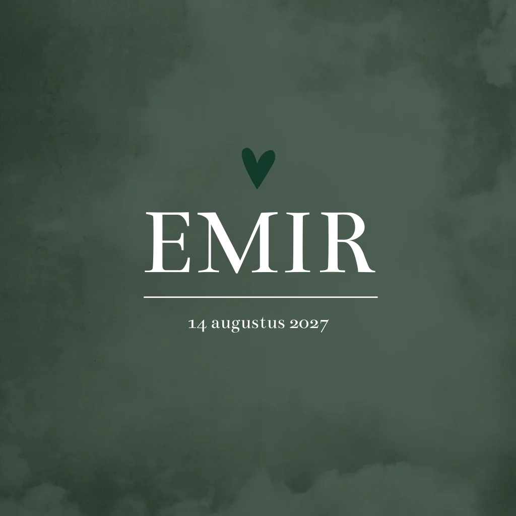 Donkergroen geboortekaartje Emir met gouden opdruk. Deze groene trendkleur is ontzettend mooi in combinatie met goudfolie. Wil je de kaarten aanpassen in kleur? Geen probleem, je past de kleur eenvoudig aan in de editor. Kies bijvoorbeeld de kleur van de babykamer.
