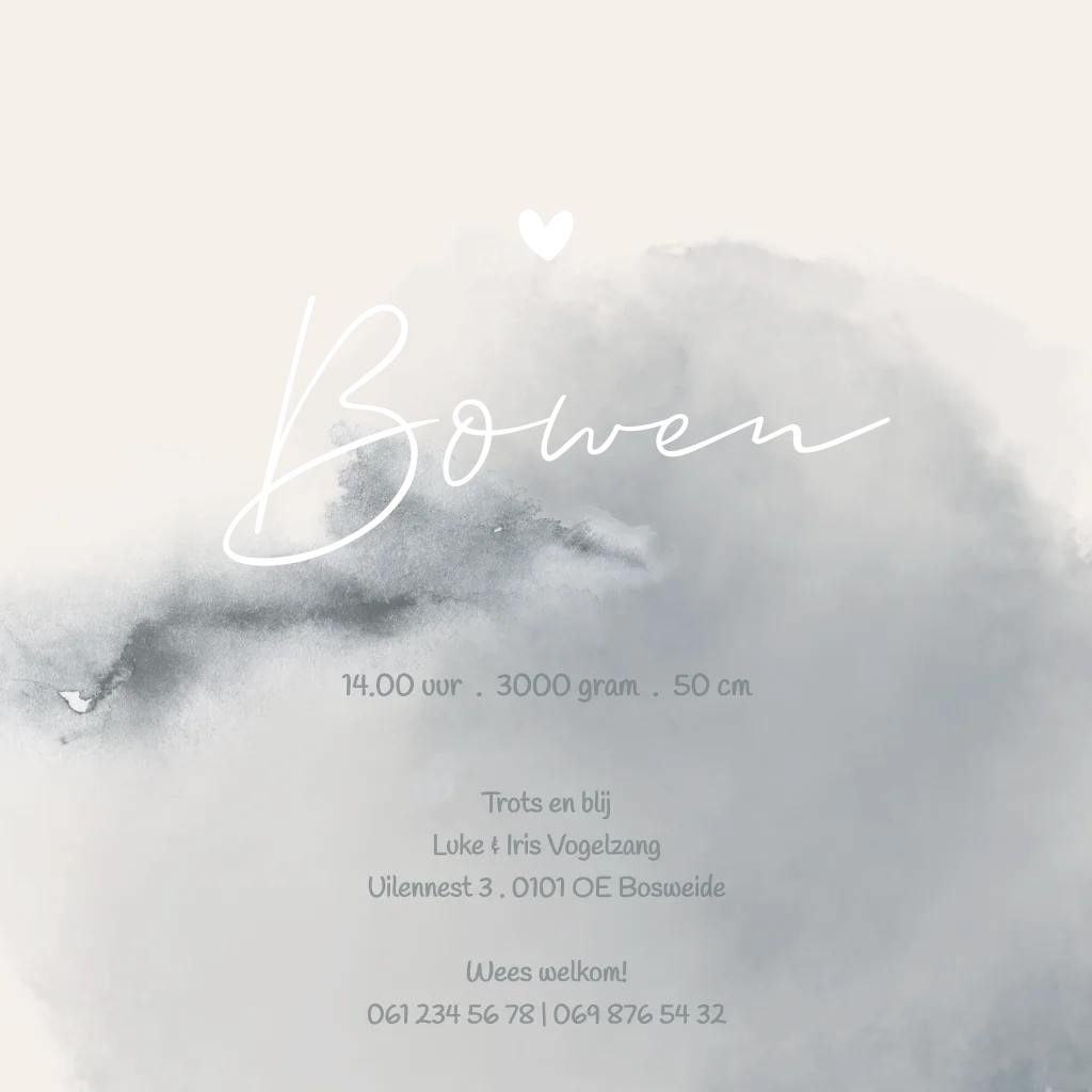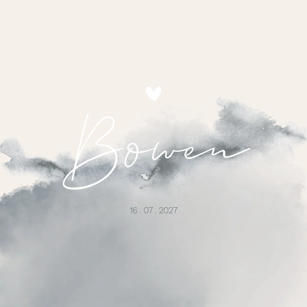 Warm, stijlvol, tijdloos en dromerig geboorte kaartje Bowen met beige/ crème achtergrond en oud grijs blauwe wolkjes in watercolor effect.