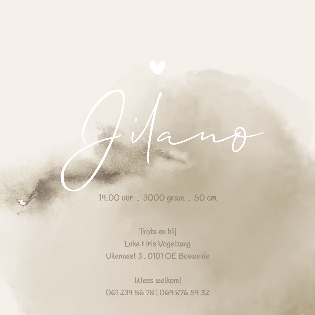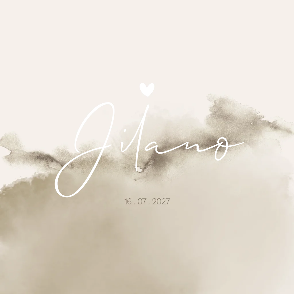 Warm, stijlvol, tijdloos en dromerig geboorte kaartje Jilano met beige/ crème achtergrond en beige/ taupe/ bruine wolkjes in watercolor effect. Perfect voor de herfst. De naam springt er uit met goudfolie. Je kunt de kaart volledig zelf aanpassen in onze online editor.