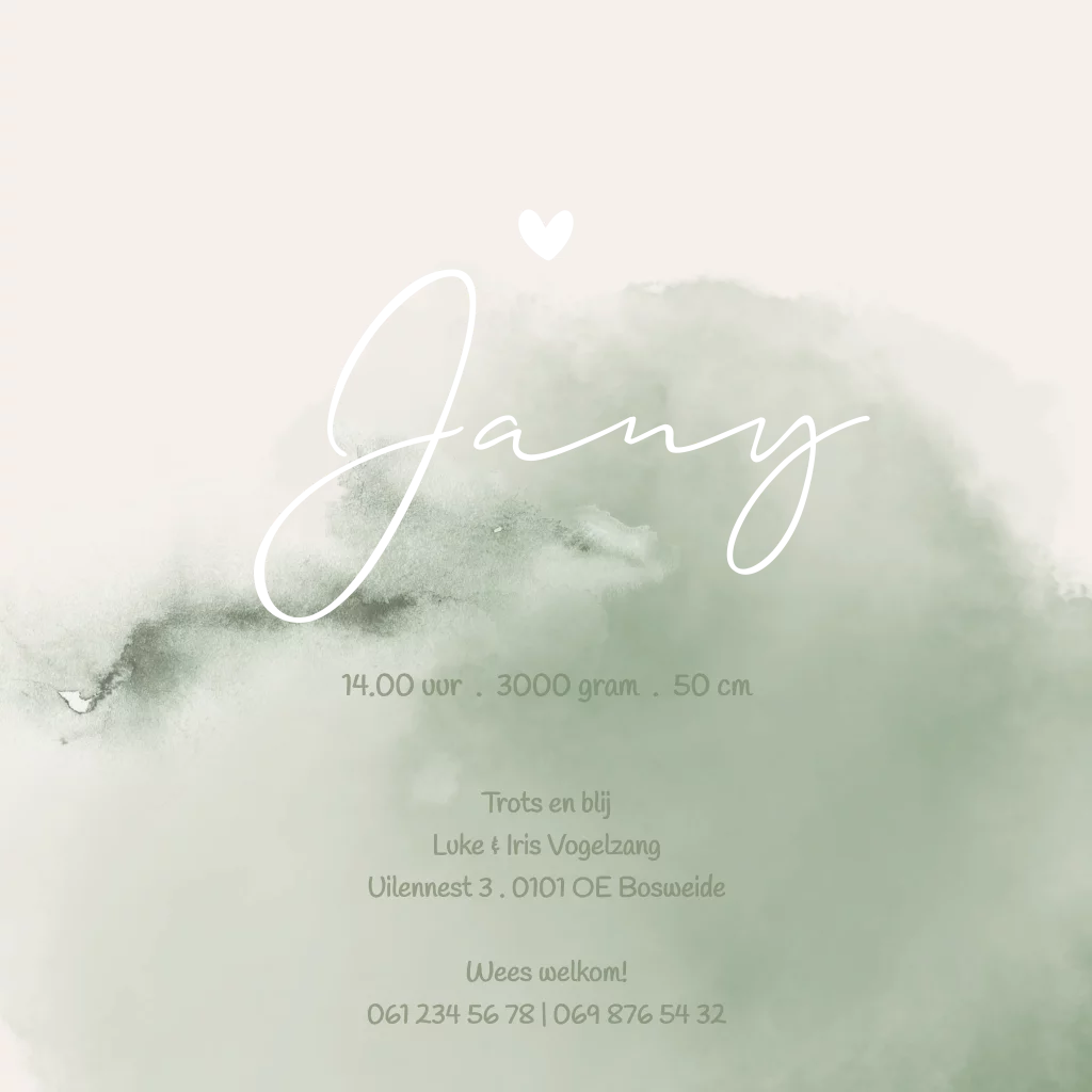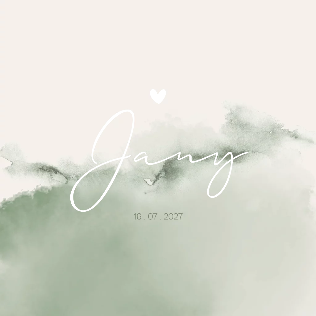 Warm, stijlvol, tijdloos en dromerig geboorte kaartje Jany met beige/ crème achtergrond en groene wolkjes in watercolor effect.