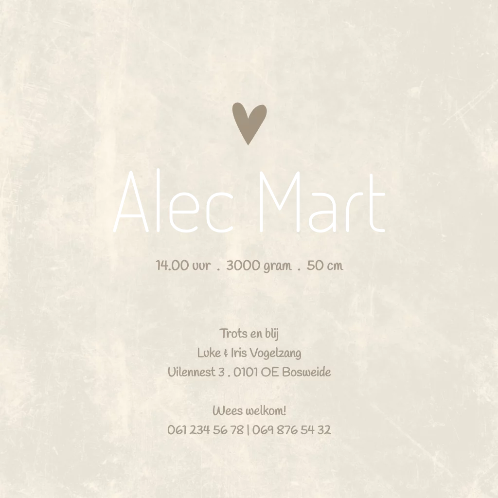 Warm, stijlvol, tijdloos en stoer geboorte kaartje Alec met beige/ creme kleurige achtergrond met een vlekkerig effect. De naam springt er uit met koperfolie. Je kunt de kaart volledig zelf aanpassen in onze online editor.
