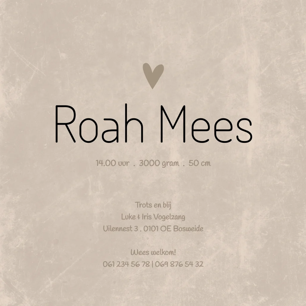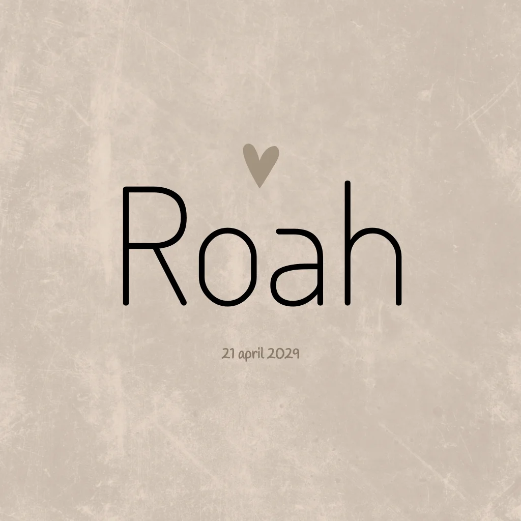 Warm, stijlvol, tijdloos en stoer geboorte kaartje Roah met bruine/ taupe kleurige achtergrond met een vlekkerig effect. De naam springt er uit in het zwart. Je kunt de kaart volledig zelf aanpassen in onze online editor.