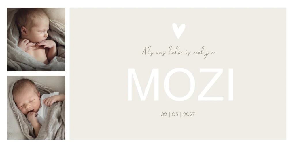 Chique neutraal geboortekaartje met 2 babyfoto's en een beige/ crème kleurvlak met witte letters. Kaart Mozi is prachtig in zijn eenvoud, maar wil je er iets aan veranderen? Je maakt het helemaal eigen in onze editor!