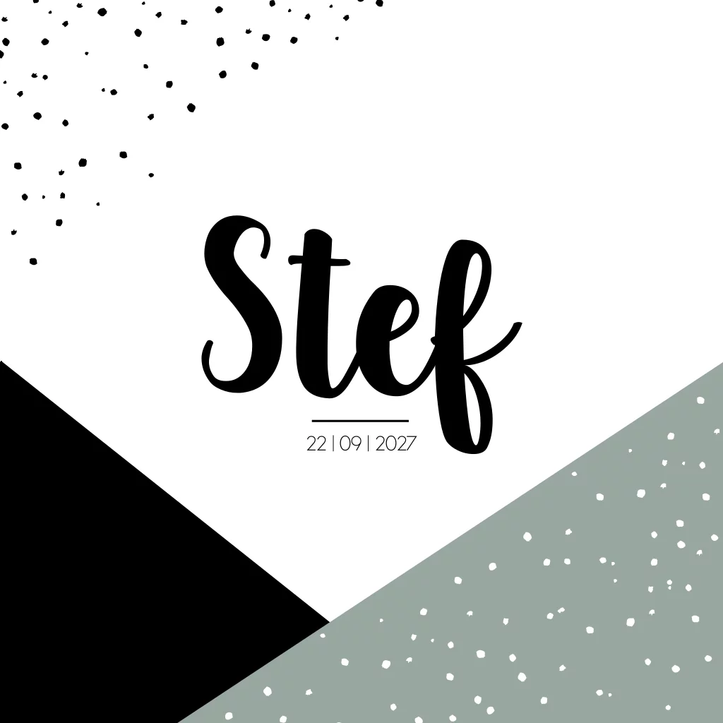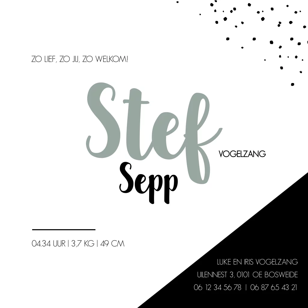 Een geboortekaartje met zwarte en earlydew groene kleurvlakken. Kaartje Stef is erg stoer maar door de stippen weer speels. Pas gemakkelijk zelf de kaart in onze editor.