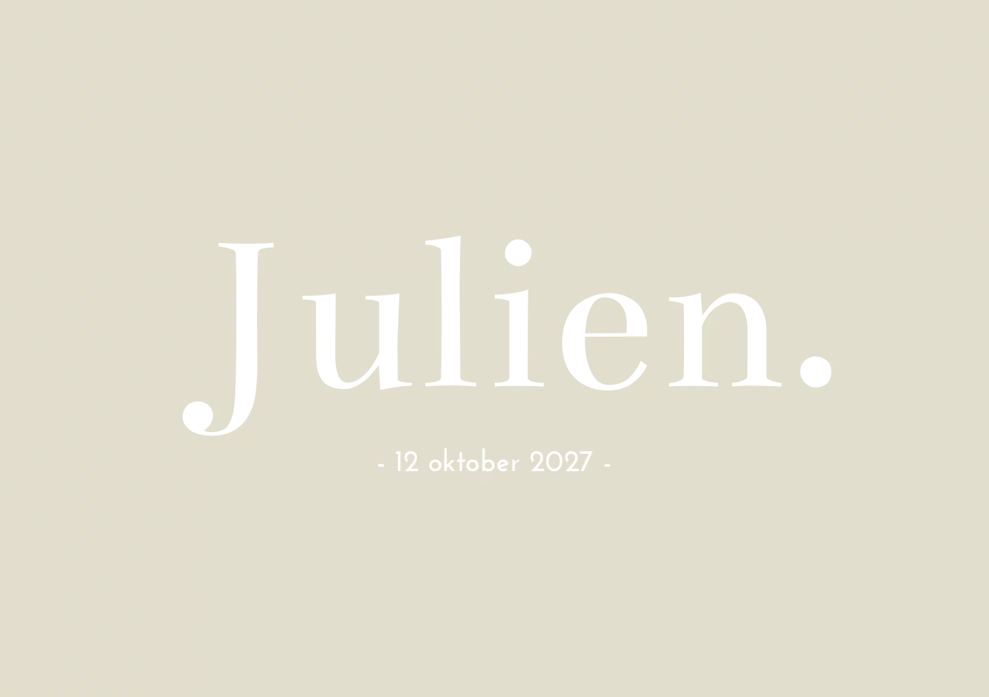 Stijlvol neutraal geboortekaartje Julien in beige/ crème kleur met de naam in goudfolie en witte letters voor de overige teksten. Deze kaart is gender neutraal en kan voor beide geslachten gebruikt worden. Je past de kaart gemakkelijk en snel aan in onze editor, maak er iets moois van!