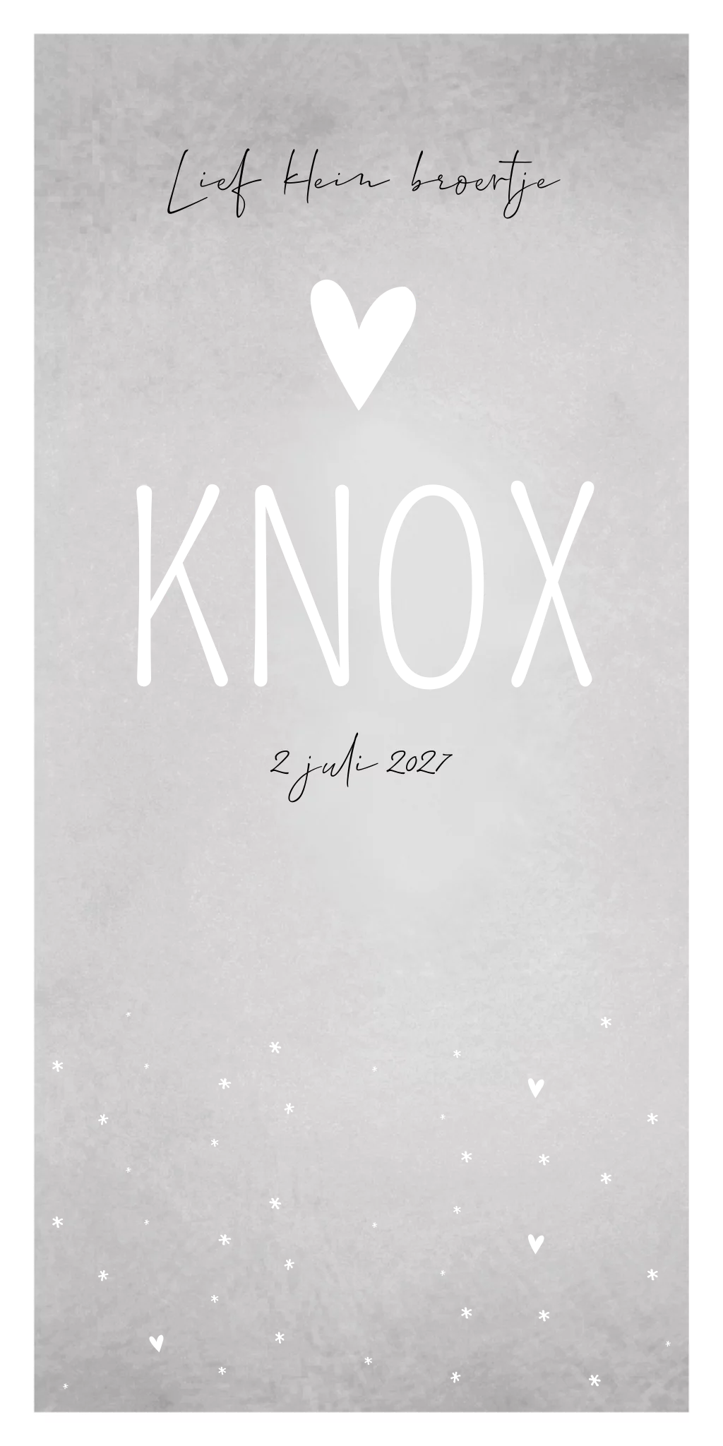 Een stoer geboortekaartje met een grijze betonlook als achtergrond. Het kaartje heeft een witte omranding. Kaartje Knox is een stoer kaartje, maar door de combinatie van het sierlijke lettertype is het perfect in balans!