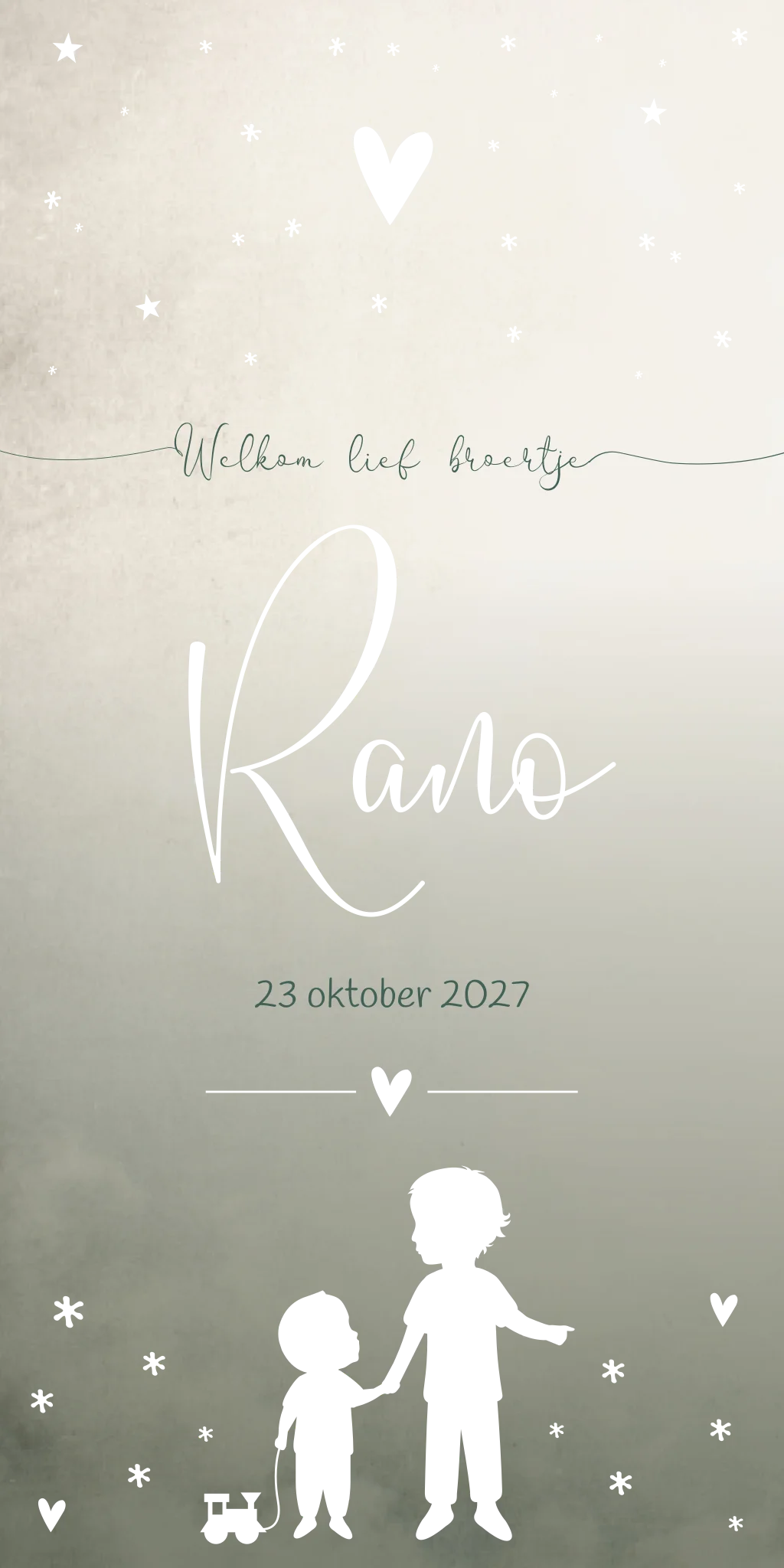 Super stoere geboortekaart Rano met een donkergroen/ beige gewolkte achtergrond. De hartjes, sterretjes en silhouet illustraties van de beide broertjes en het treintje zijn in koperfolie afgebeeld. Je kunt dit helemaal eigen maken in de editor, de kleuren, de foliekleur, de illustraties en de lettertypes aanpassen!