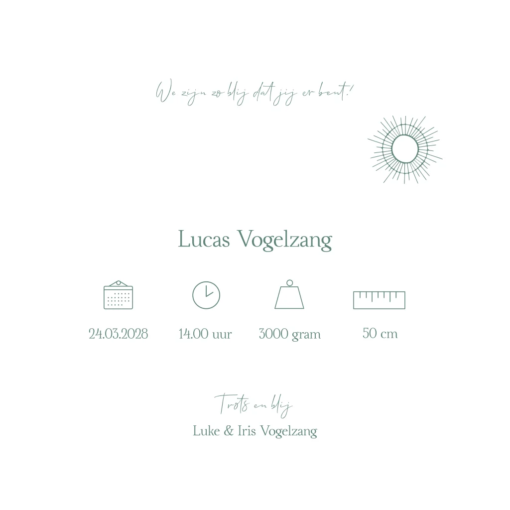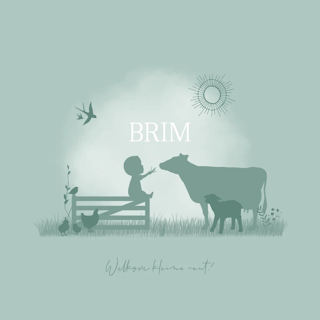 Een illustratieve kaart Brim in groene kleur, met een doorkijkje naar het boerderij leven. Een klein jongetje zit op een boeren hek in het weiland en voert de koe wat gras. Een lammetje kijkt toe en in het tafereel zijn ook een moeder kip en kuikens te zien, een vogeltje dat op het hekje zit en zwaluwen vogels die voorbij vliegen. De bloemetjes sieren het kaartje. Wil je het tafereel aanpassen naar jouw wensen? Voeg dan een paard toe of een kalfje, een hond of kat. Er is zoveel mogelijk! In de beeldbank vind je alle illustraties die je op de kaart kunt toevoegen. Heb je onze hulp nodig, laat het ons weten.