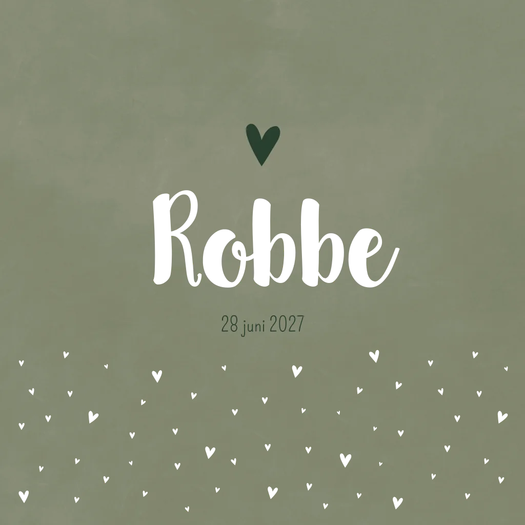 Groen gewolkt geboorte kaartje met hartjes. Geboortekaartje Robbe is zeer geschikt voor goudfoliedruk.