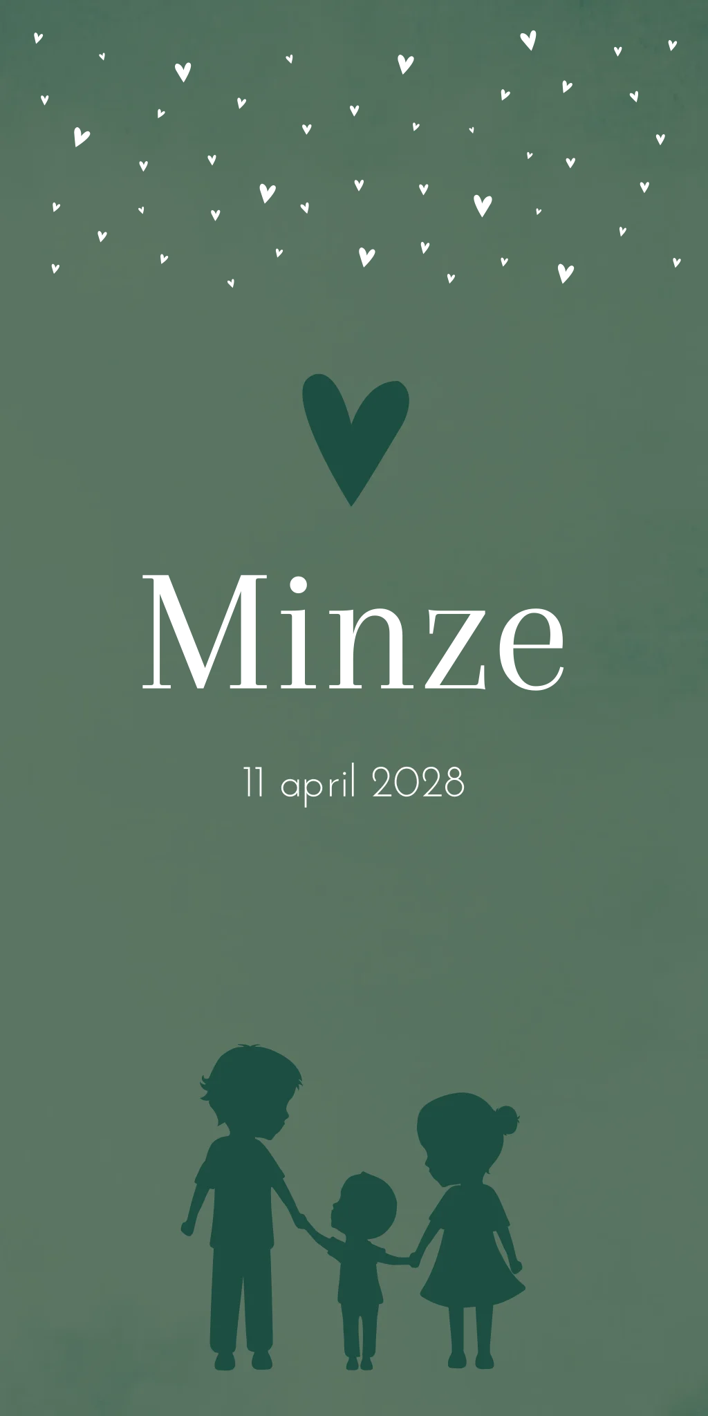 Een warm groen geboortekaartje met hartjes in goudfolie en een illustratie van je gezin in donkergroene kleur. In de beeldbank kun je je eigen gezinssamenstelling vinden. Zit jouw gezinssituatie er niet bij? Mail of app ons dan, dan kunnen wij het voor je ontwerpen.