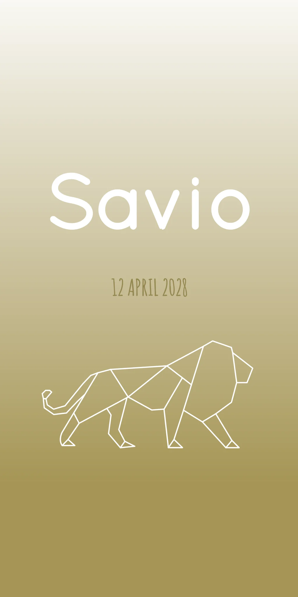 Een goud groen kleurige kaart met een overloop naar wit, met een grafische lijntekening van een leeuw. Je kunt de lijntekening aanpassen naar andere dieren of silhouetten, zo ook van kindjes/ broertjes/ zusjes.