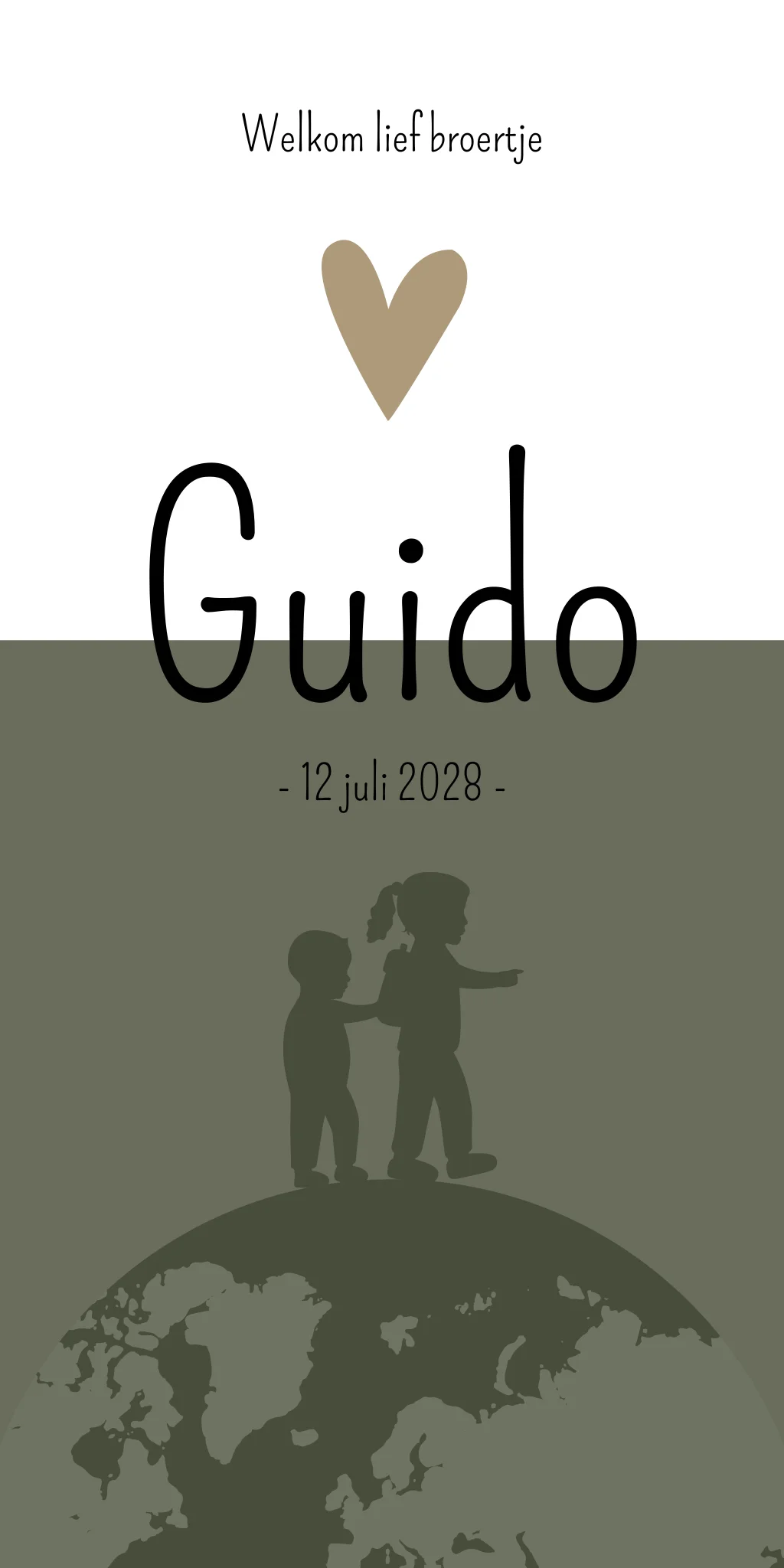 Een stoer groen geboortekaartje met een wereldbol met grote zus en haar broertje met een rugzak, die op ontdekkingstocht gaan. Geboortekaartje Guido is een strak kaartje. Tip! Maak het kaartje extra leuk door een label toe te voegen en deze te bevestigen door middel van een paperclip. Dit ontwerp is ook erg mooi met foliedruk.