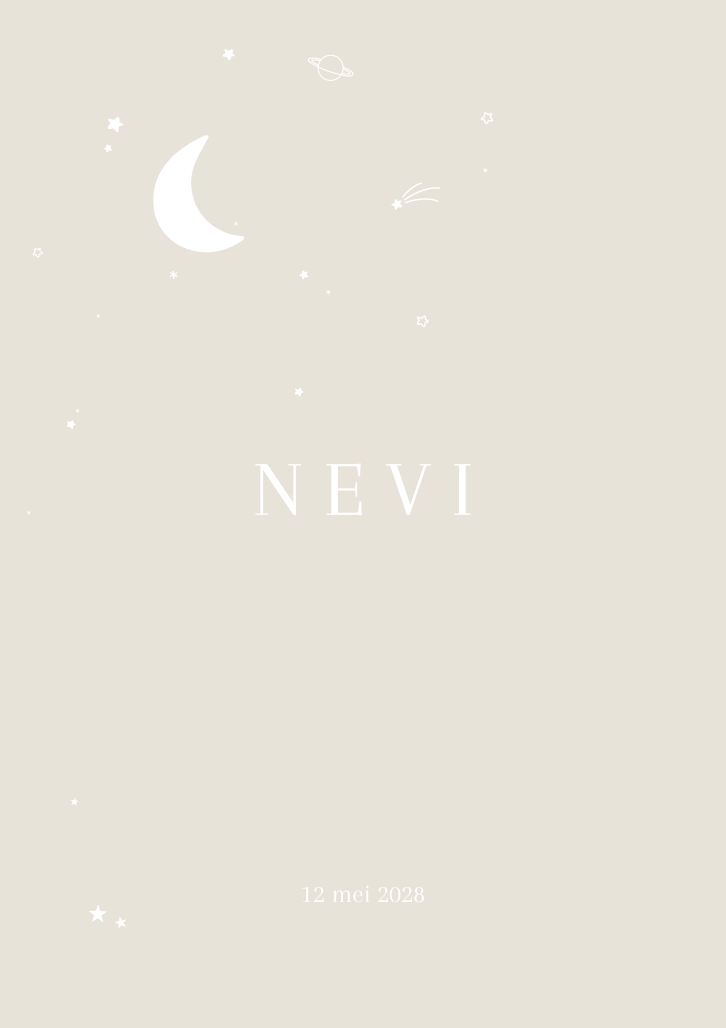 Beige creme babykaart met sterren en planeten uit het helaas en een maantje in goudfolie. Je past de kaart Nevi aan naar je eigen wensen qua kleur, opmaak en lettertype. Vraag een proefdruk aan en bekijk het kaartje thuis.