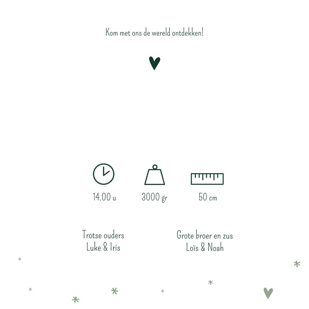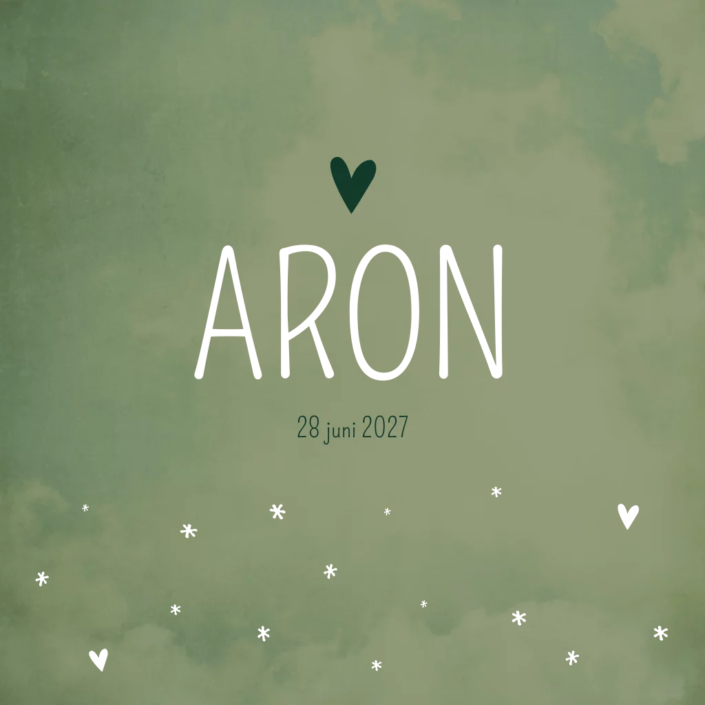 Helder groen gewolkt geboortekaartje Aron met koperen hartjes en sterretjes. Kaartje Aron is super mooi wanneer je het laat bedrukken met koperfolie. Liever een andere achtergrond kleur of lettertype? Je past het kaartje helemaal naar eigen wens aan in de editor.